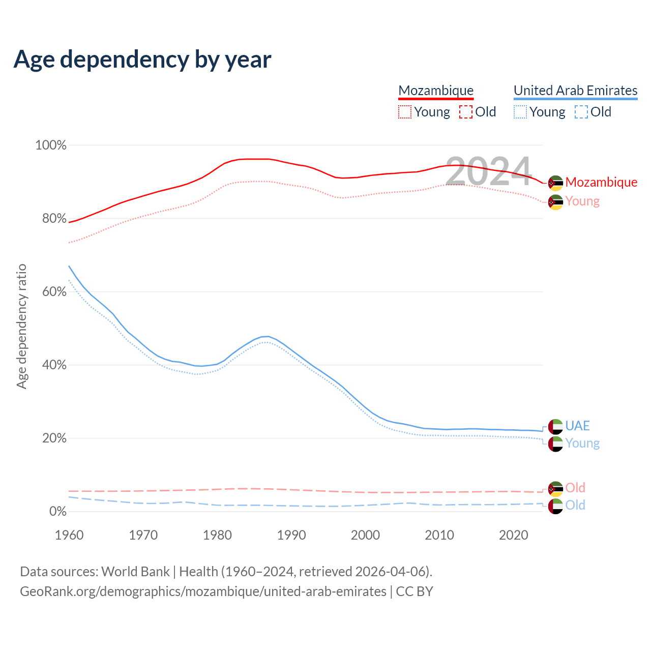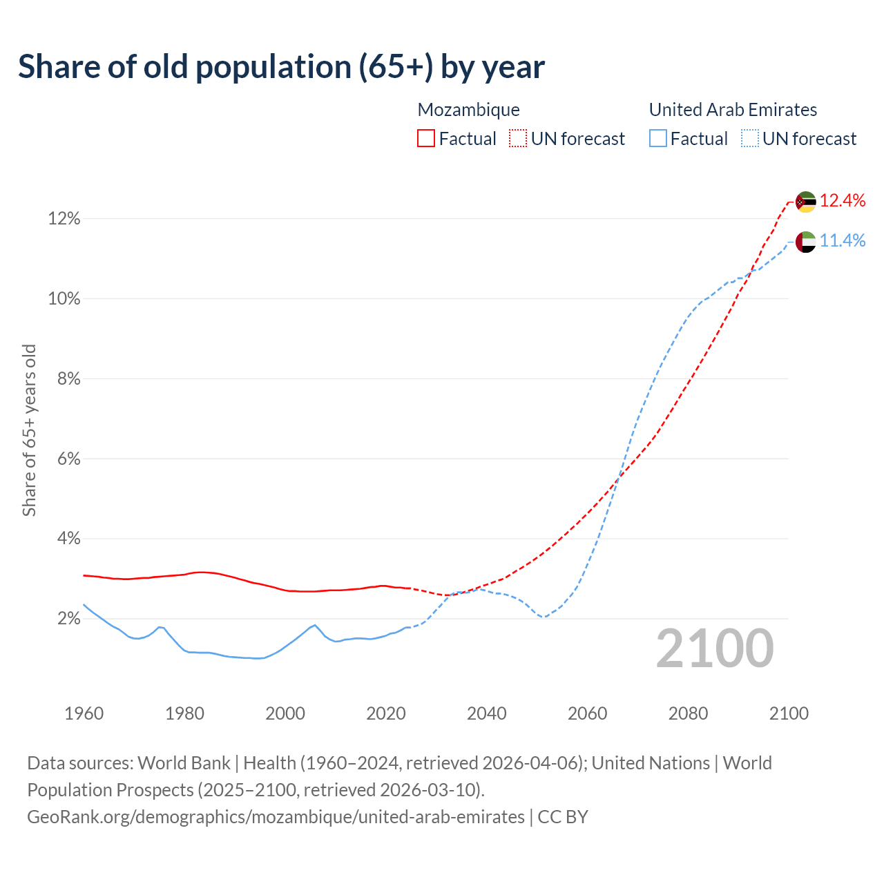 - The share of old-age demographic (65+) in Mozambique is 2.75% vs 1.77% in the United Arab Emirates.