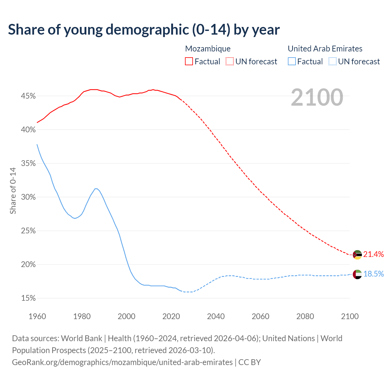 - The share of young demographic (0-15 years old) in Mozambique is 44.5% vs 16.1% in the United Arab Emirates.