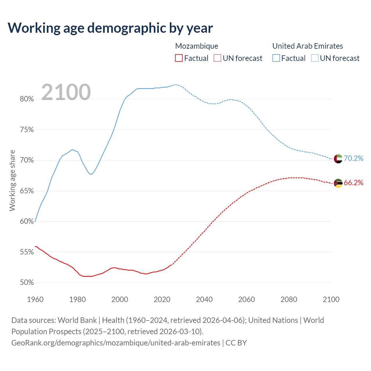 - Mozambique has 19.5M working age adults (aged 15-64) vs 9.6M in the United Arab Emirates.