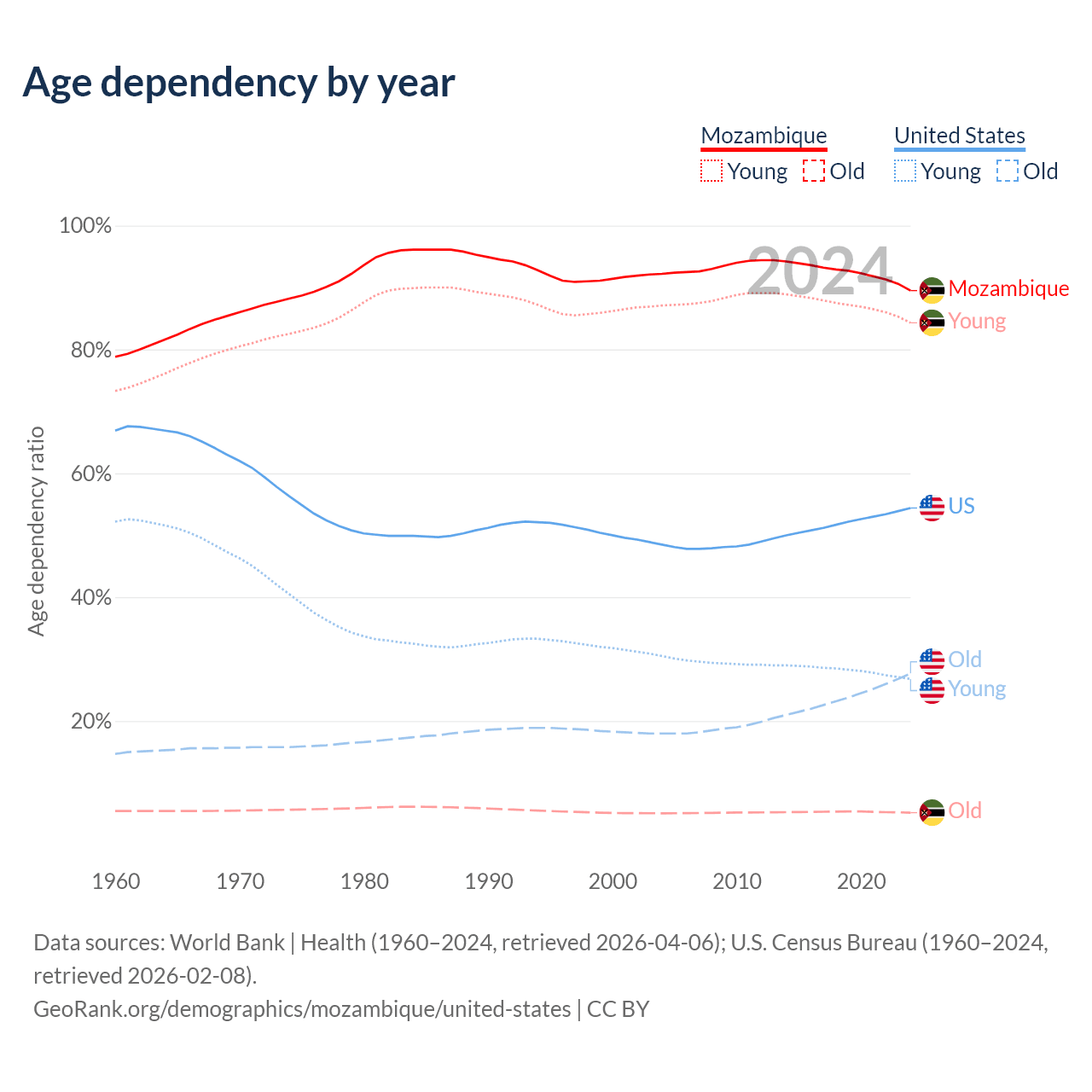 - The share of old-age demographic (65+) in Mozambique is 2.75% vs 17.9% in the United States.