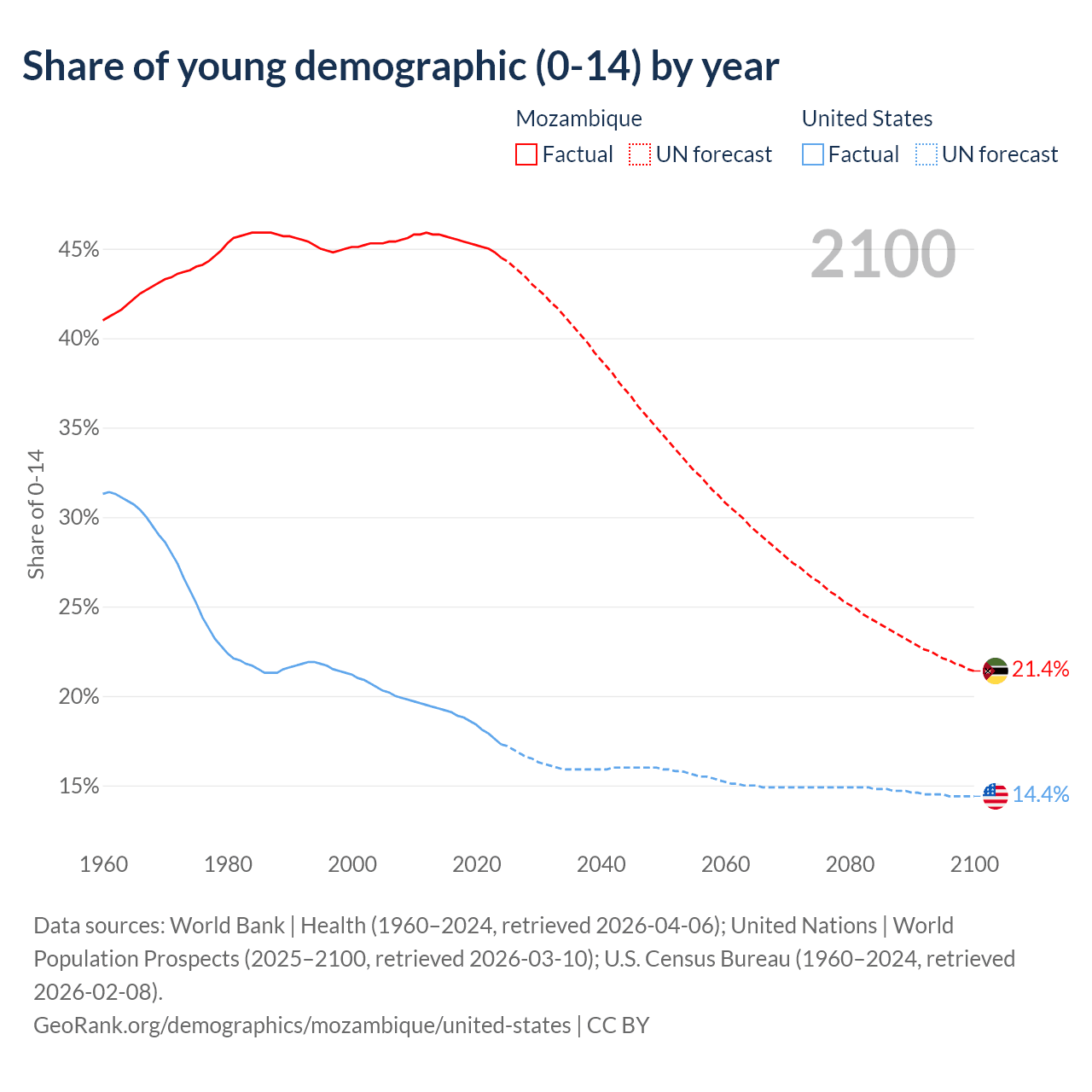 - The share of young demographic (0-15 years old) in Mozambique is 44.5% vs 17.3% in the United States.