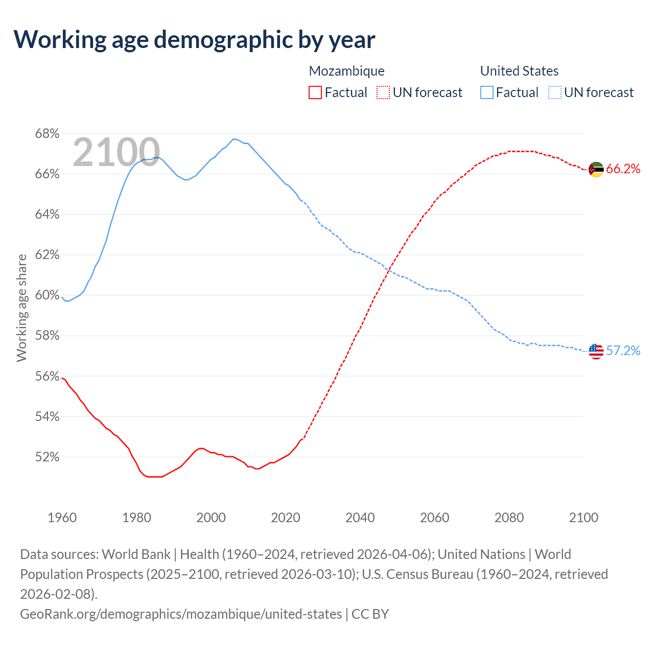- Mozambique has 19.5M working age adults (aged 15-64) vs 223M in the United States.