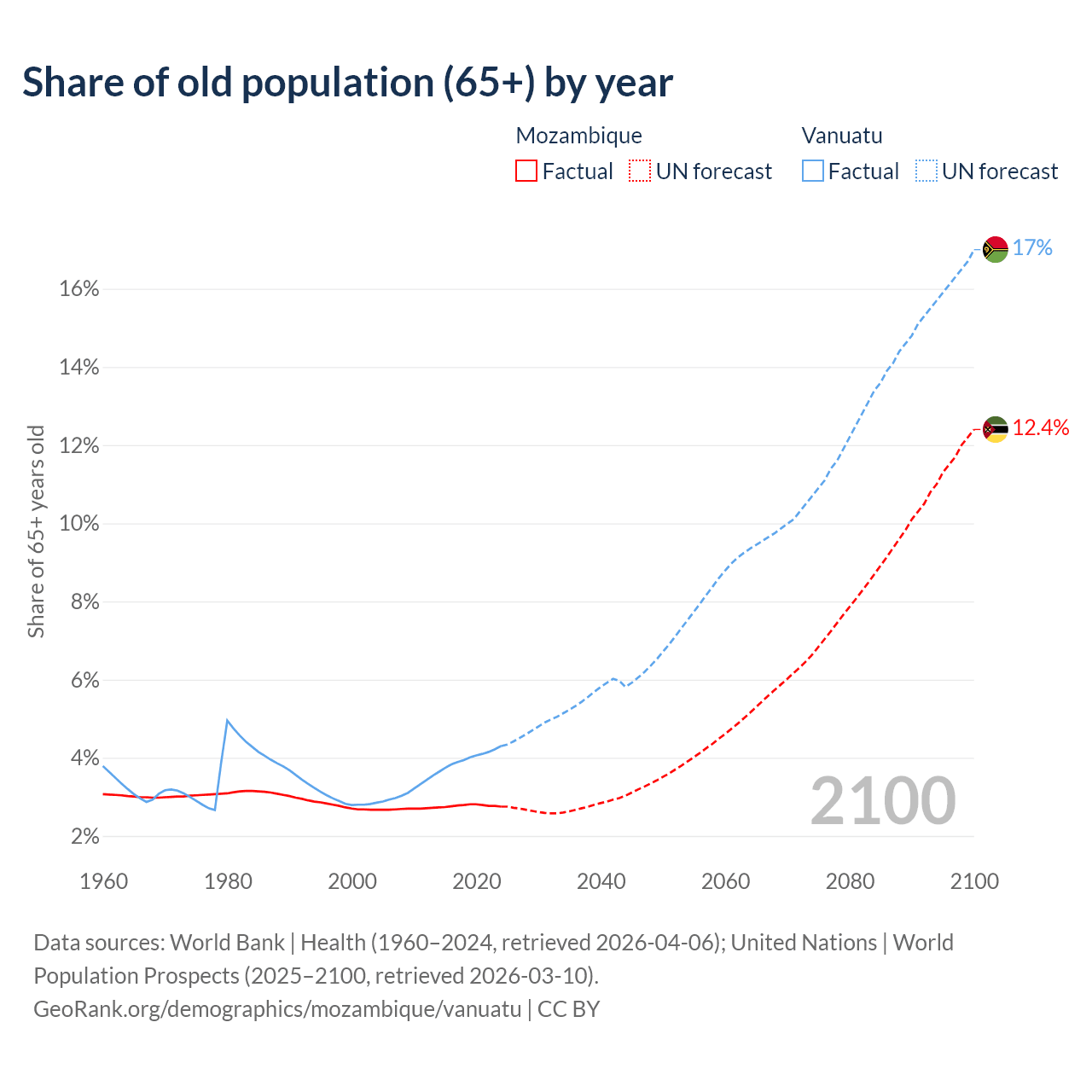 The share of older people aged 65 and over is 2.75% in Mozambique and 4.3% in Vanuatu. Life expectancy in Mozambique compared to Vanuatu .