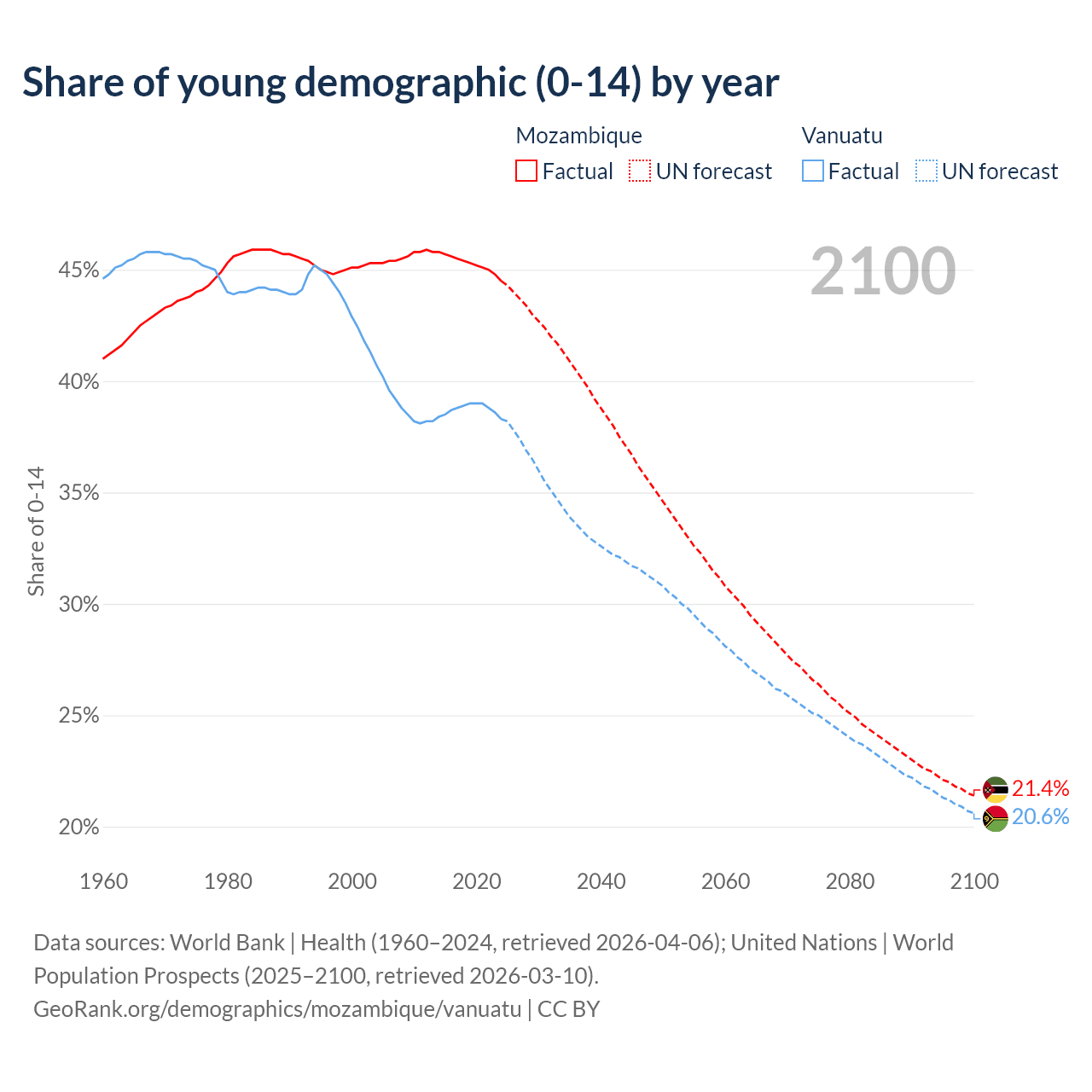 - The share of young demographic (0-15 years old) in Mozambique is 44.5% vs 38.3% in Vanuatu.