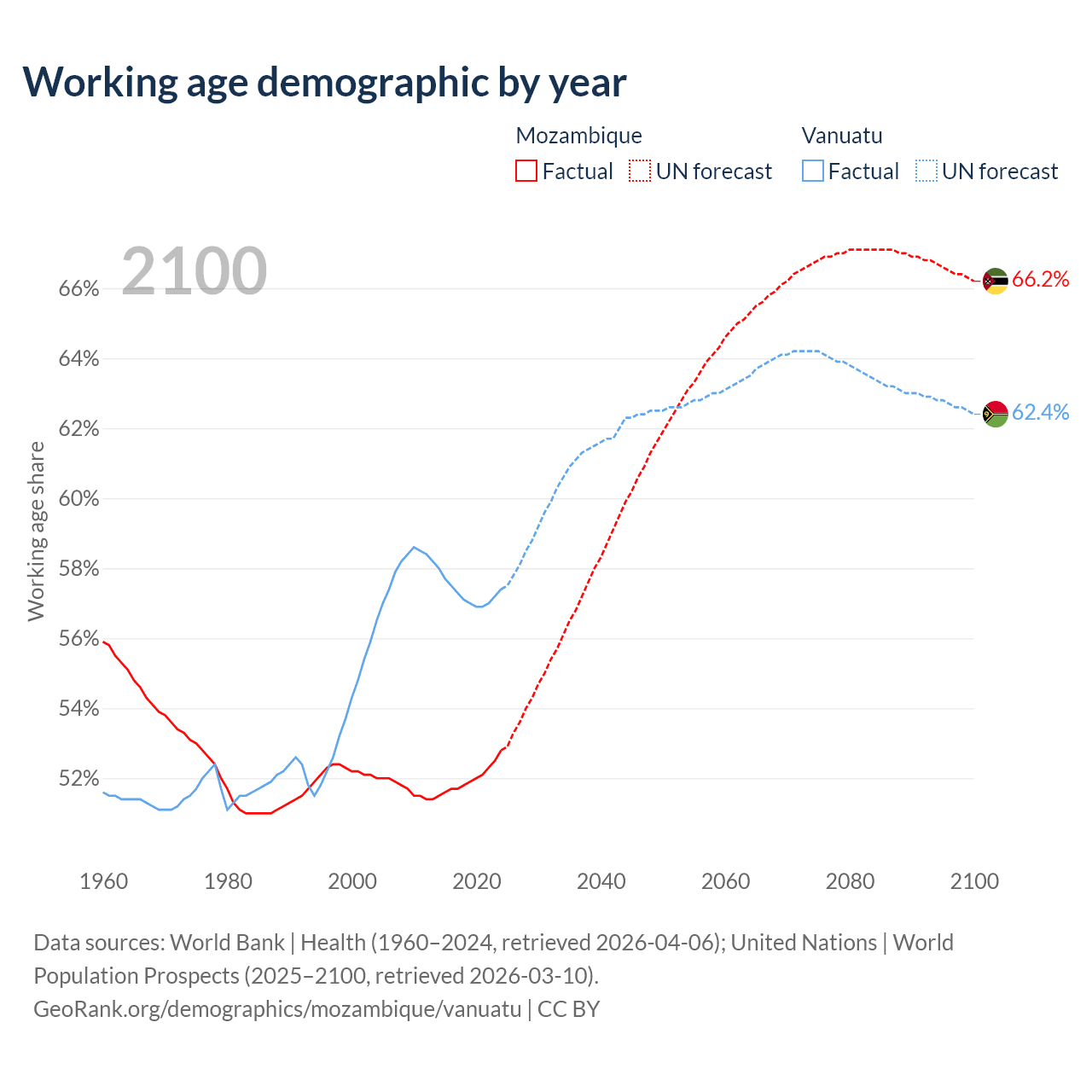 Median age Mozambique vs Vanuatu, 1960-2100