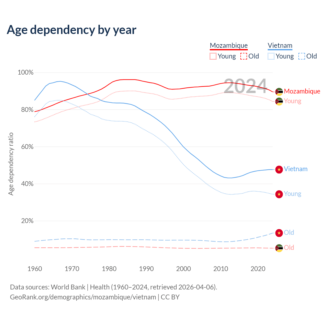 Data sources: World Bank | Health (1960–2024, retrieved 2026-04-06); U.S. Census Bureau (1960–2024, retrieved 2026-02-08).