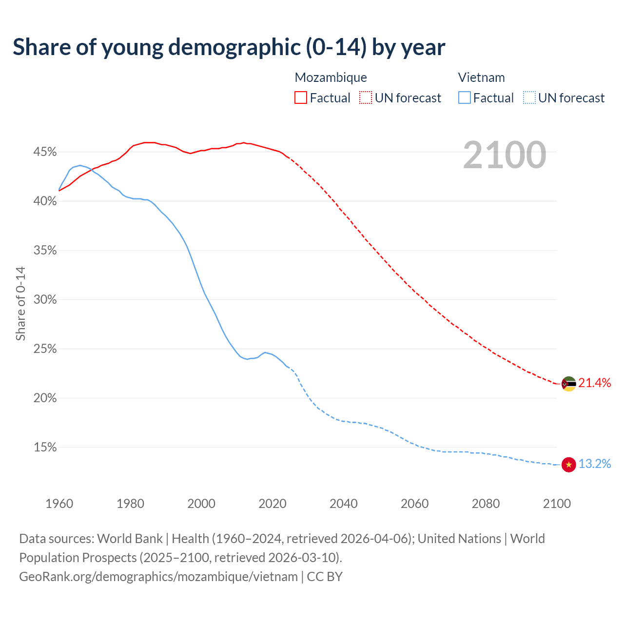 - The share of young demographic (0-15 years old) in Mozambique is 44.5% vs 23.2% in Vietnam.