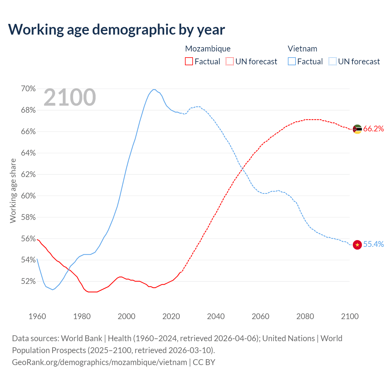 The share of older people aged 65 and over is 2.75% in Mozambique and 9.05% in Vietnam. Life expectancy in Mozambique compared to Vietnam .