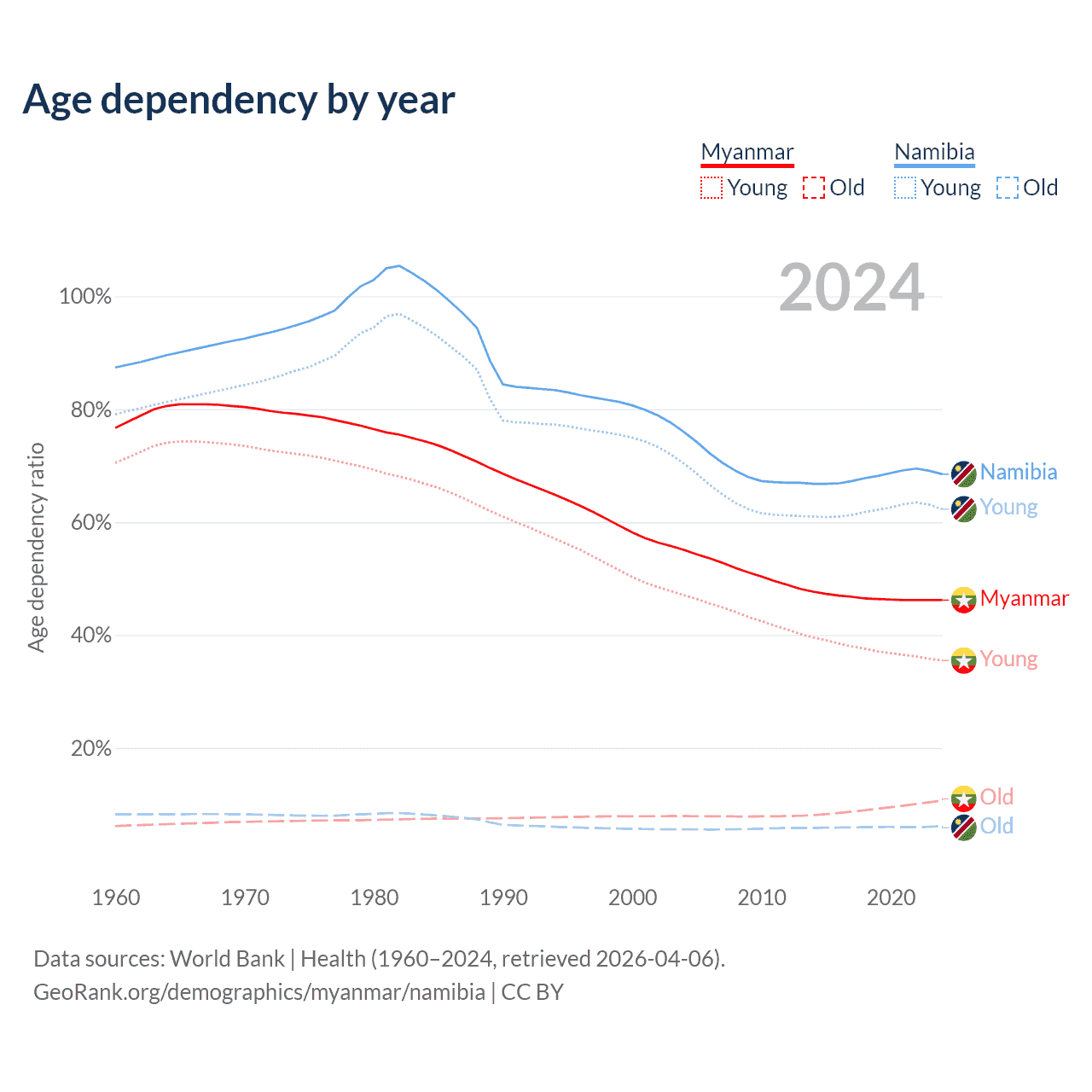Data sources: World Bank | Health (1960–2024, retrieved 2026-04-06); U.S. Census Bureau (1960–2024, retrieved 2026-02-08).