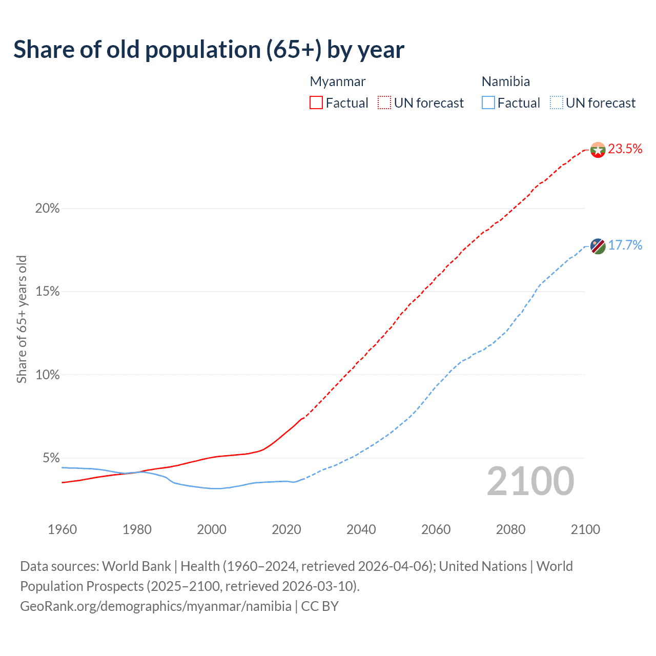 The share of older people aged 65 and over is 7.3% in Myanmar and 3.67% in Namibia. Life expectancy in Myanmar compared to Namibia .