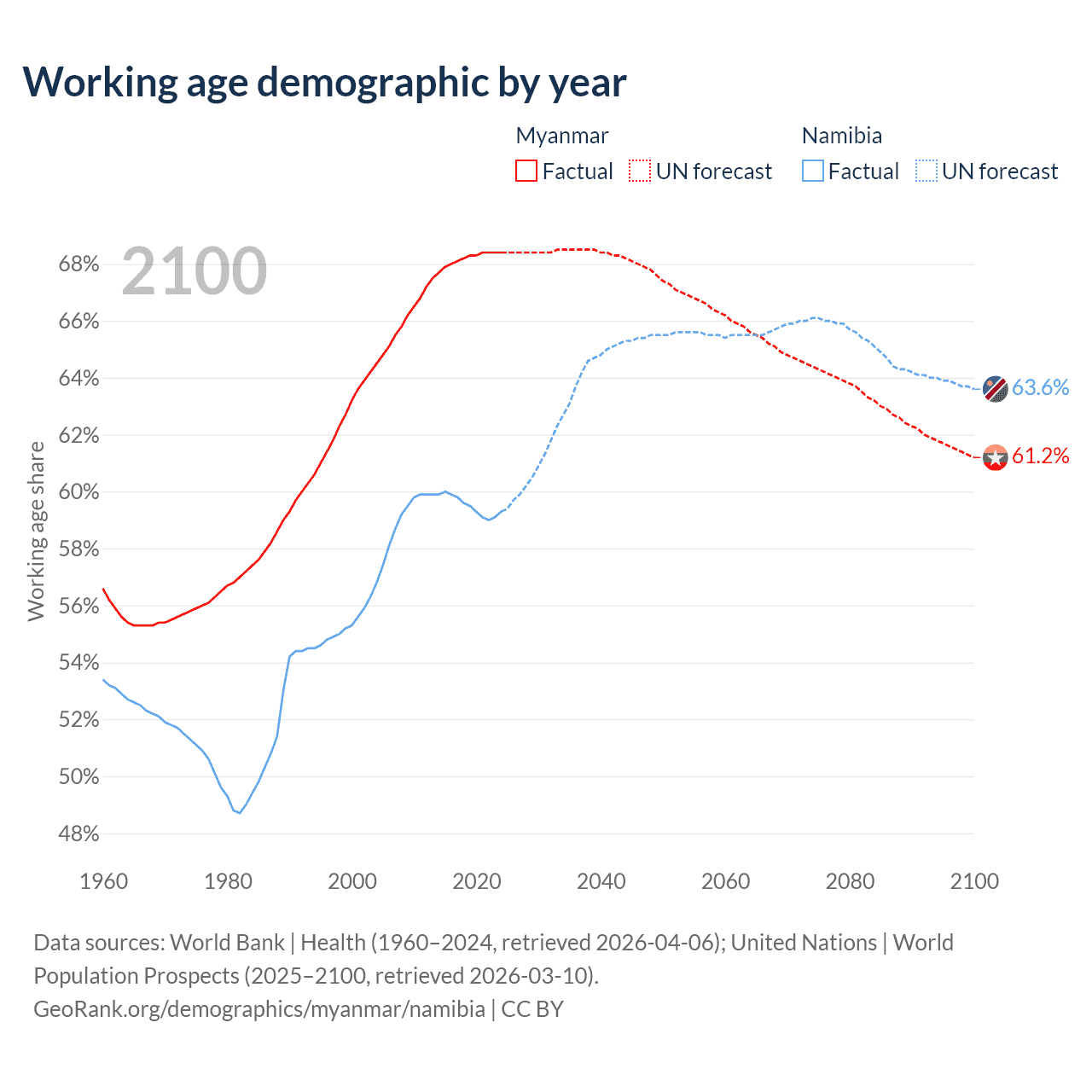 Median age Myanmar vs Namibia, 1960-2100