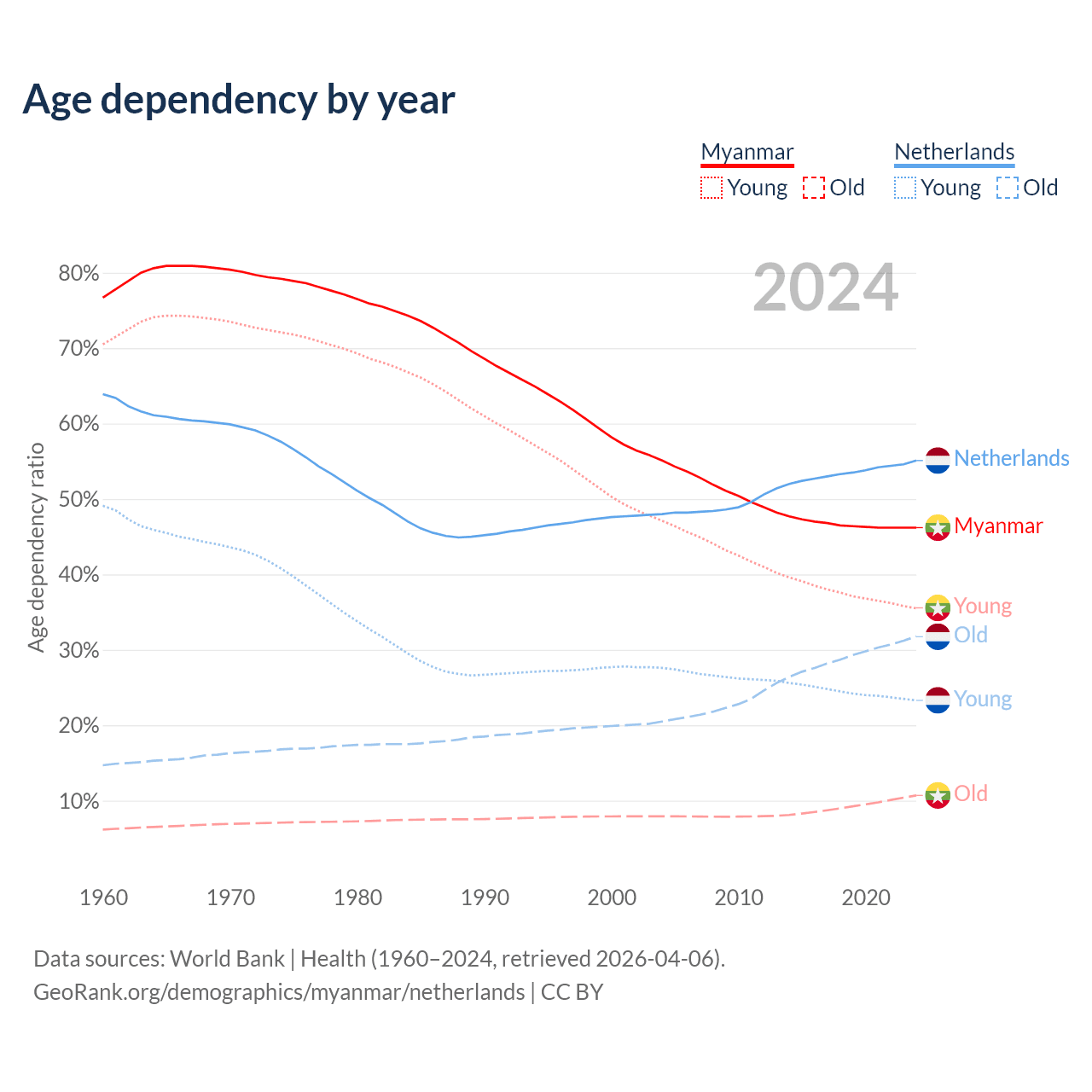 - Myanmar is ranked 96/196 by median age (oldest to youngest) vs 33/196 for the Netherlands.