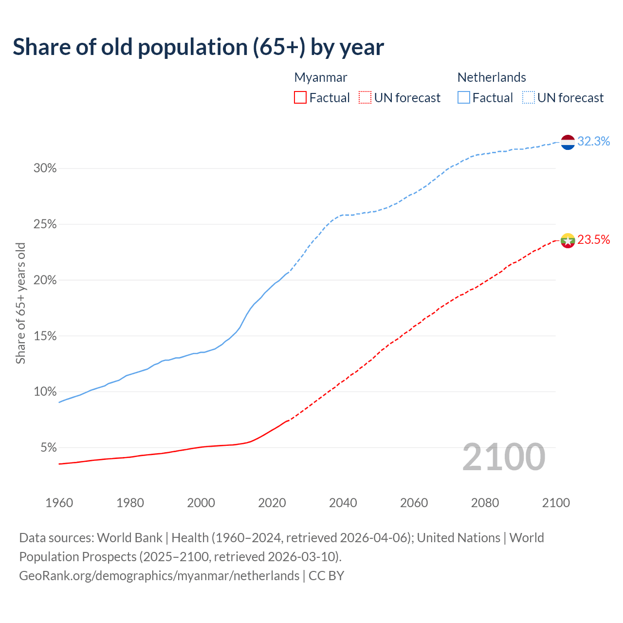 The share of older people aged 65 and over is 7.3% in Myanmar and 20.5% in the Netherlands. Life expectancy in Myanmar compared to the Netherlands .