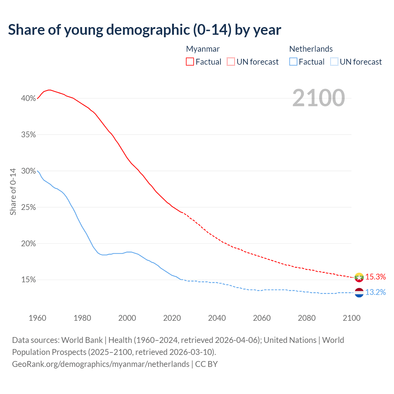 - The share of young demographic (0-15 years old) in Myanmar is 24.3% vs 15% in the Netherlands.