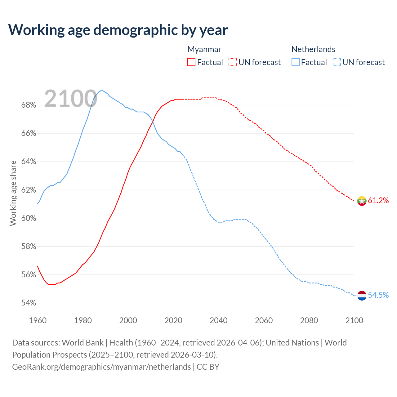- Myanmar has 37.8M working age adults (aged 15-64) vs 11.8M in the Netherlands.