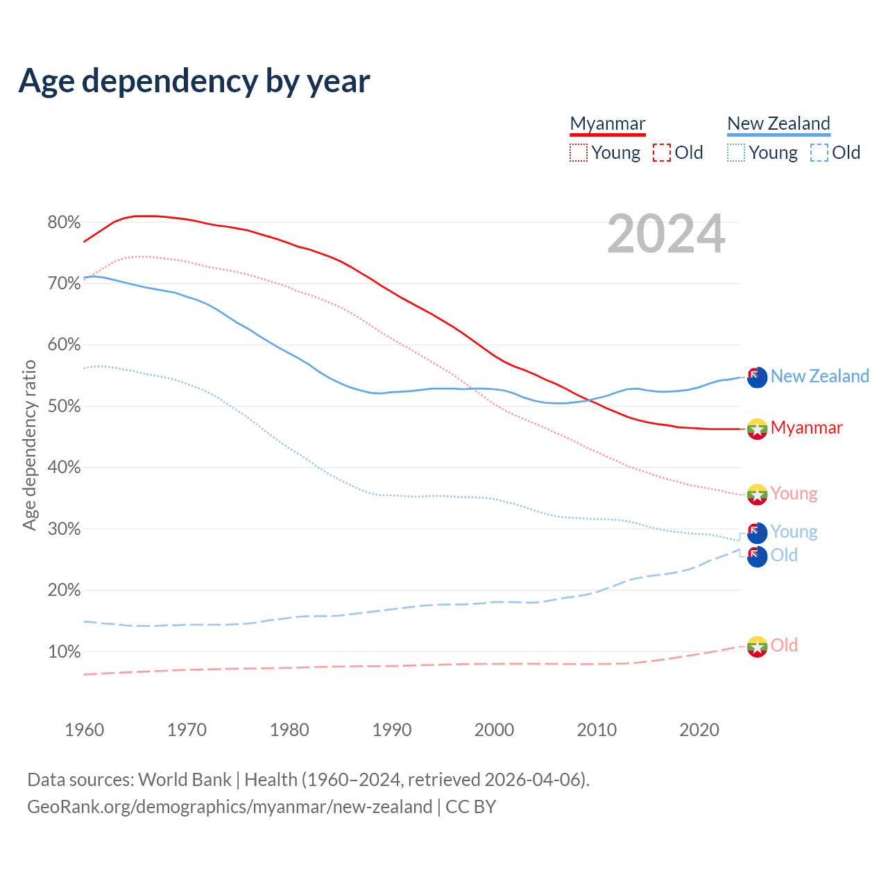 - Myanmar is ranked 96/196 by median age (oldest to youngest) vs 56/196 for New Zealand.
