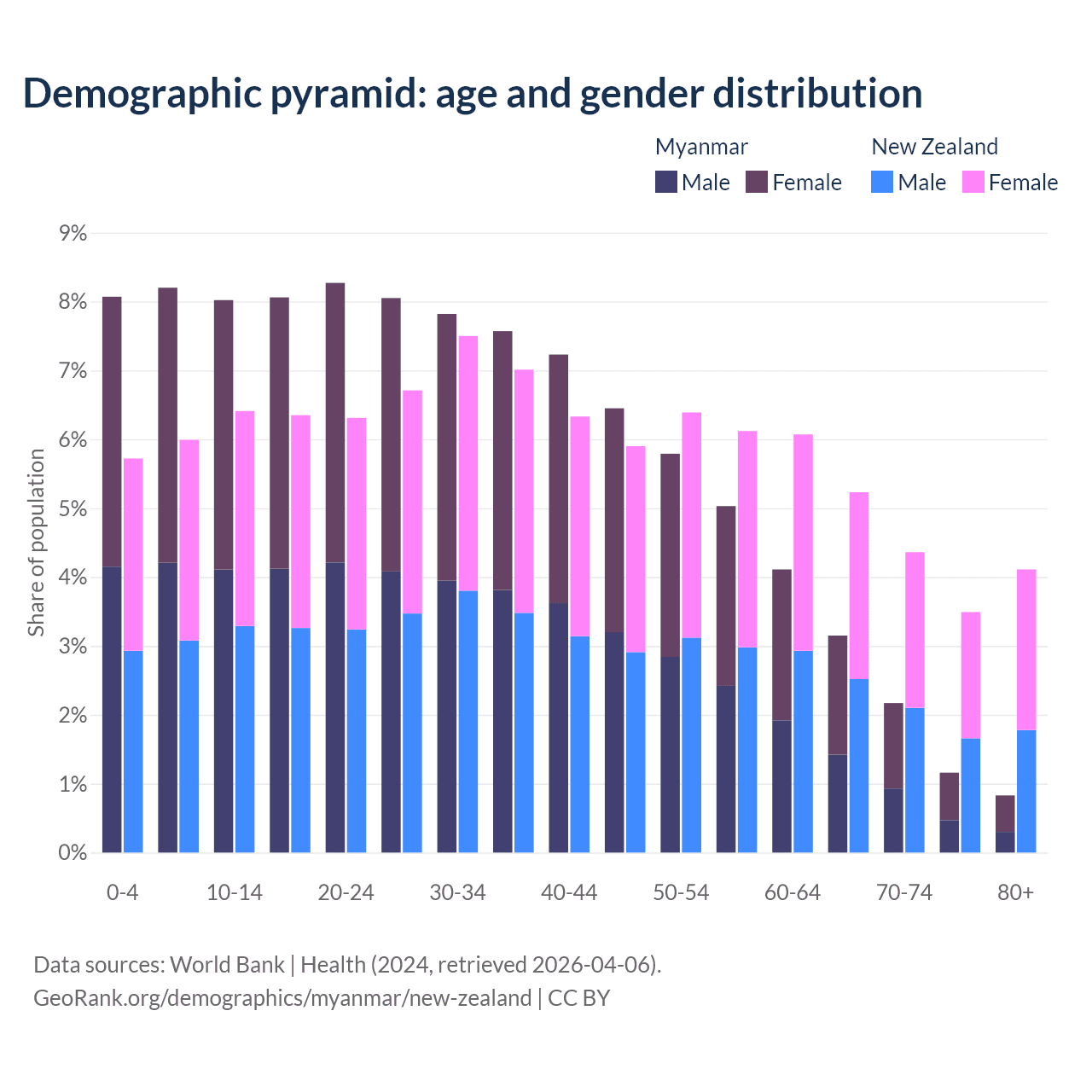- As of 2026, the population of Myanmar is 55.3M vs 5.37M in New Zealand - 10.3 times difference.