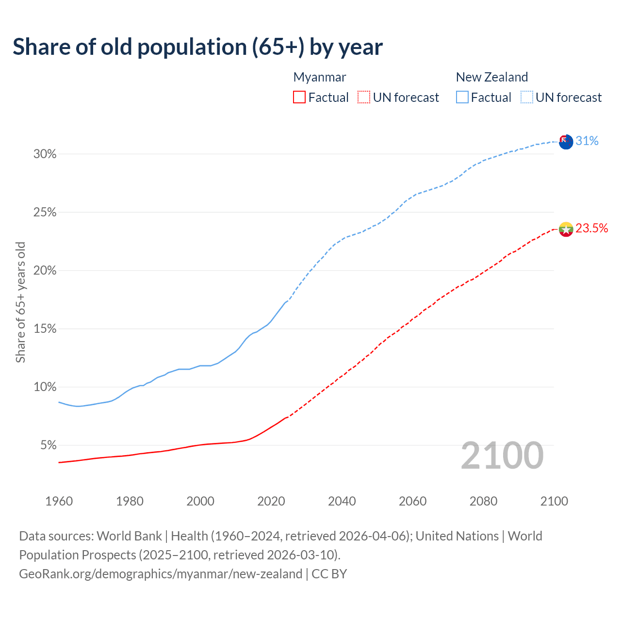 The share of older people aged 65 and over is 7.3% in Myanmar and 17.2% in New Zealand. Life expectancy in Myanmar compared to New Zealand .
