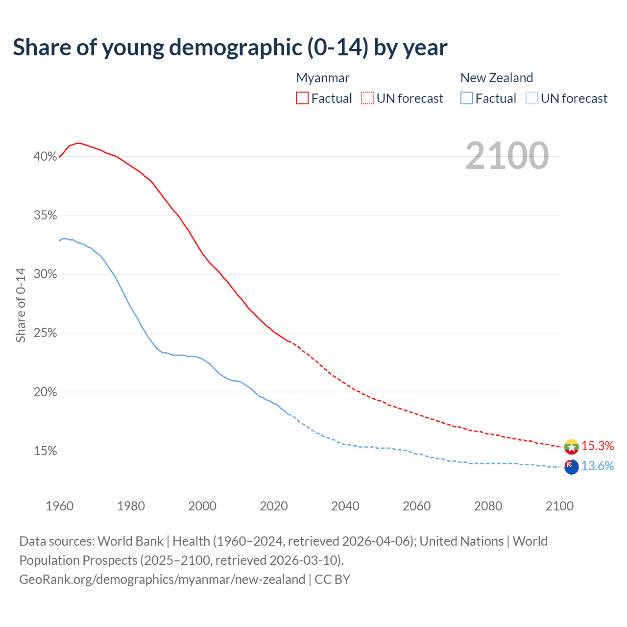 - The share of young demographic (0-15 years old) in Myanmar is 24.3% vs 18.1% in New Zealand.