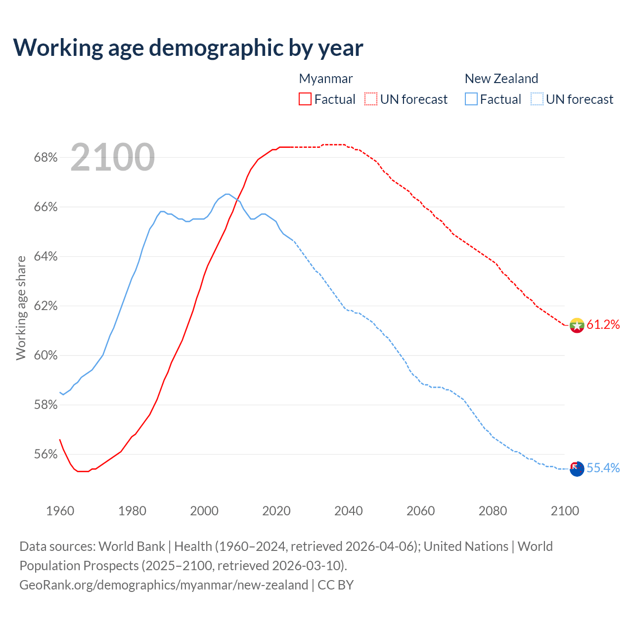 - Myanmar has 37.8M working age adults (aged 15-64) vs 3.48M in New Zealand.