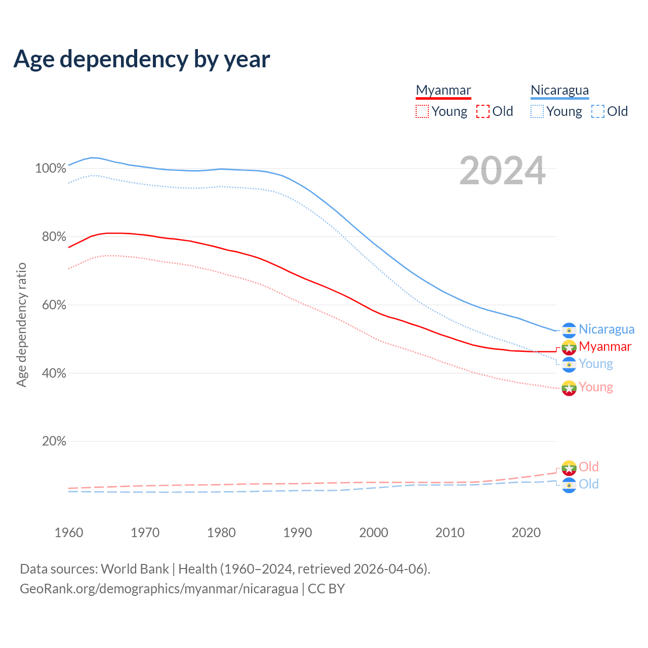 Data sources: World Bank | Health (1960–2024, retrieved 2026-04-06); U.S. Census Bureau (1960–2024, retrieved 2026-02-08).