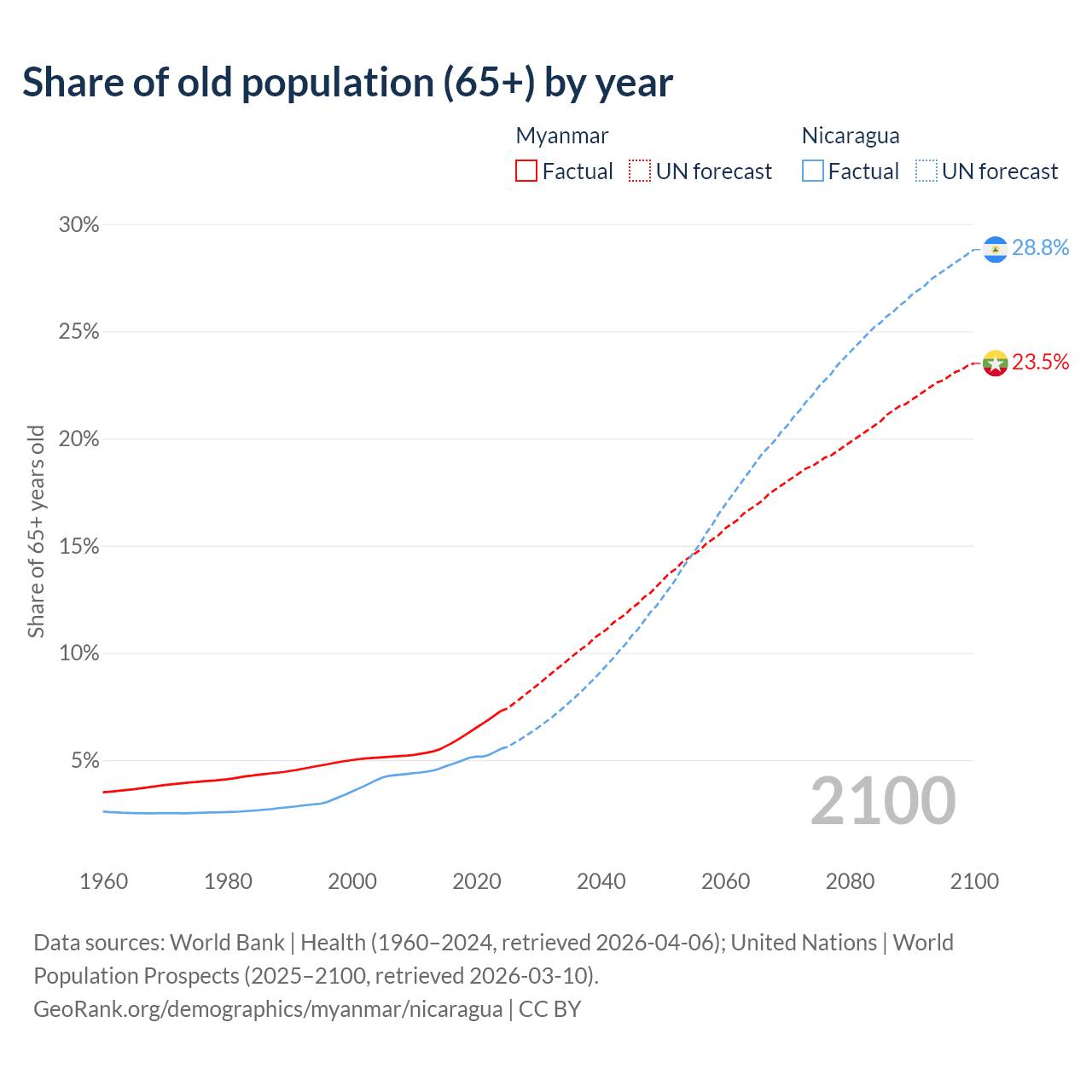The share of older people aged 65 and over is 7.3% in Myanmar and 5.53% in Nicaragua. Life expectancy in Myanmar compared to Nicaragua .