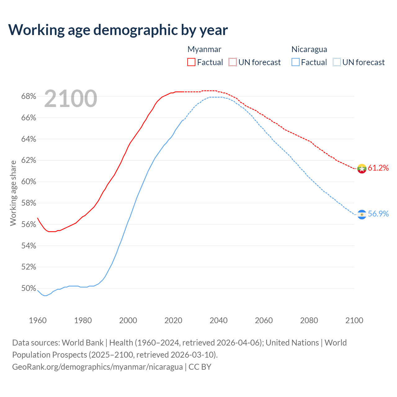 Median age Myanmar vs Nicaragua, 1960-2100