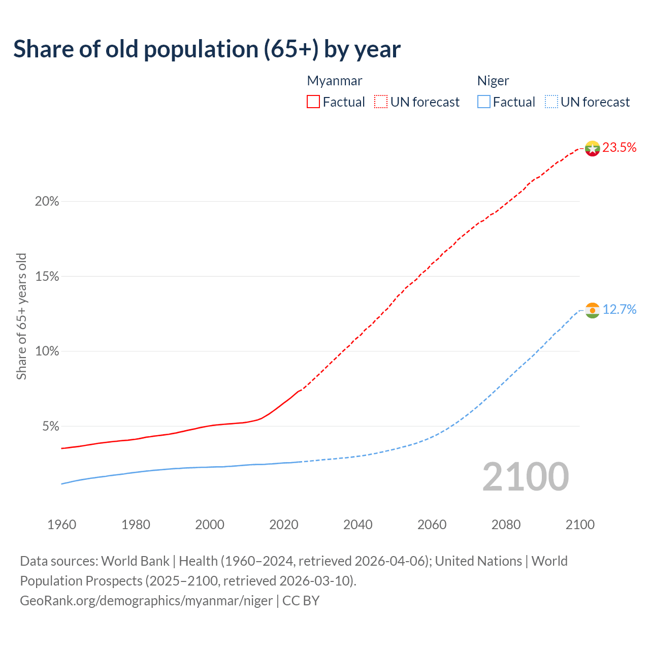 The share of older people aged 65 and over is 7.3% in Myanmar and 2.59% in Niger. Life expectancy in Myanmar compared to Niger .
