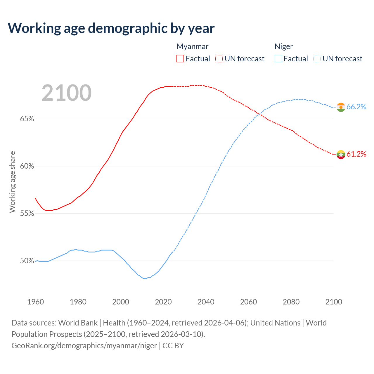 Median age Myanmar vs Niger, 1960-2100