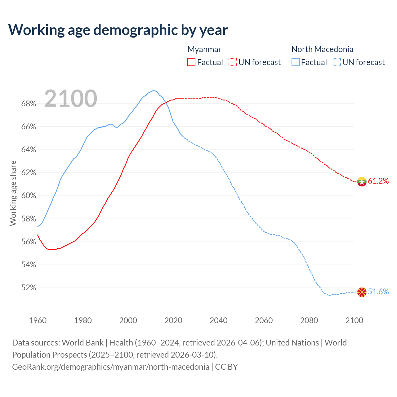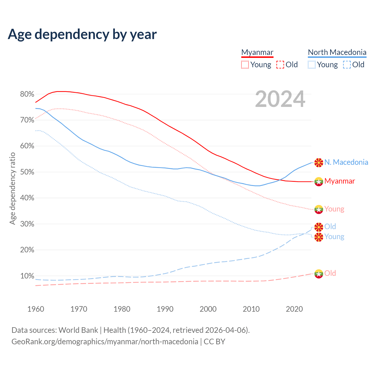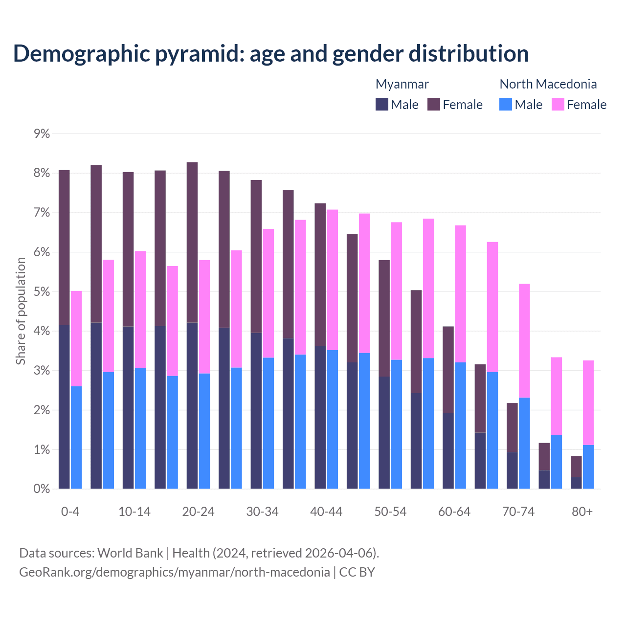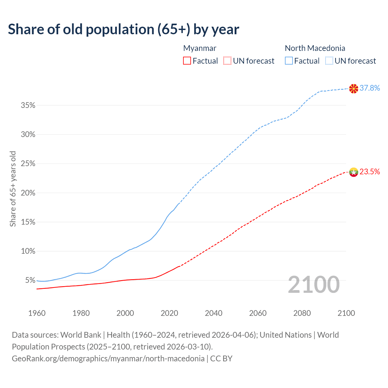 The share of older people aged 65 and over is 7.3% in Myanmar and 18% in North Macedonia. Life expectancy in Myanmar compared to North Macedonia .