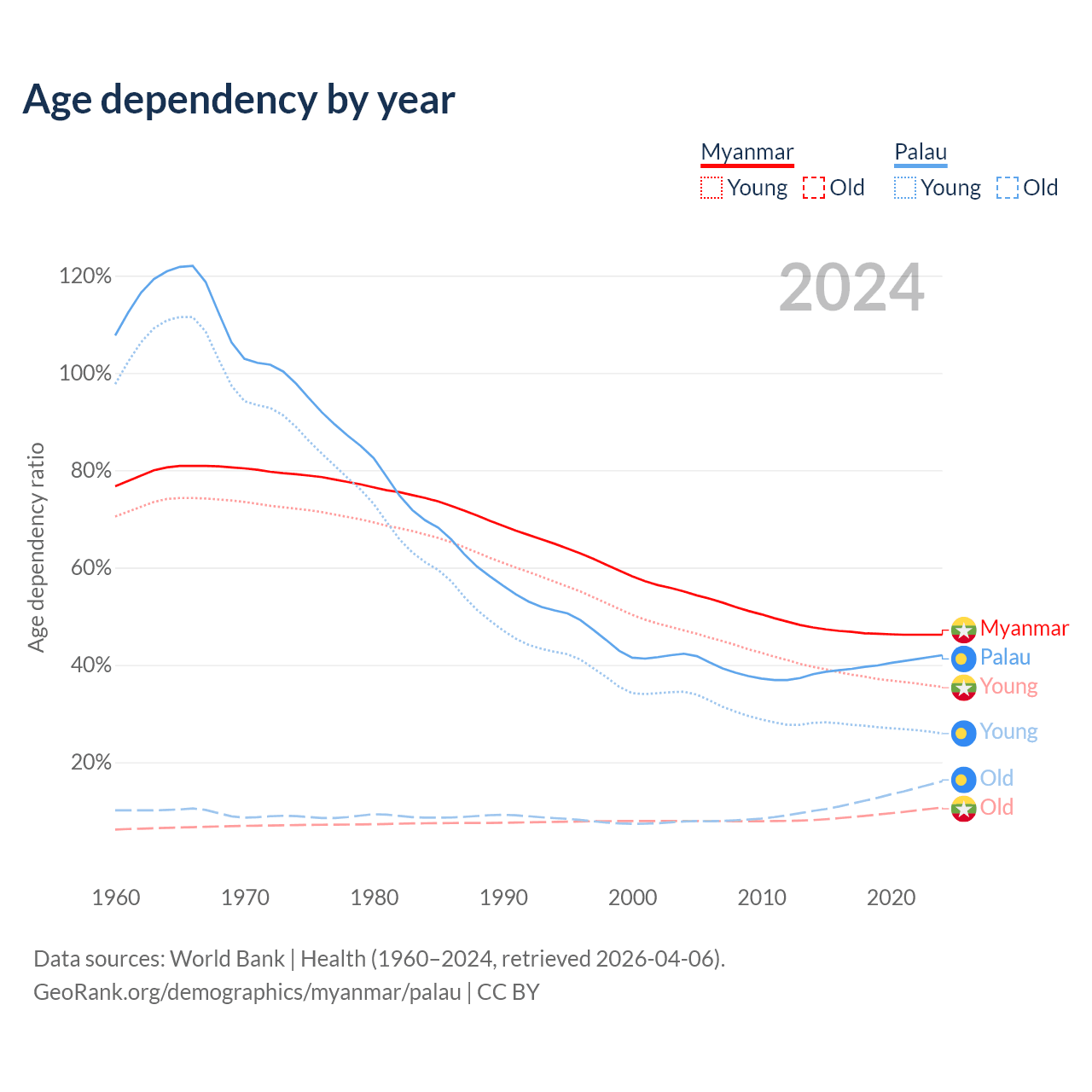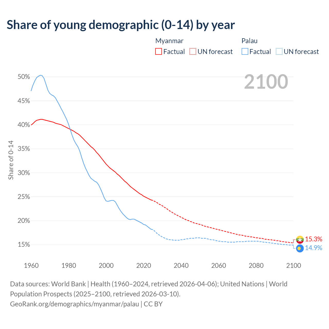 - The share of young demographic (0-15 years old) in Myanmar is 24.3% vs 18.2% in Palau.