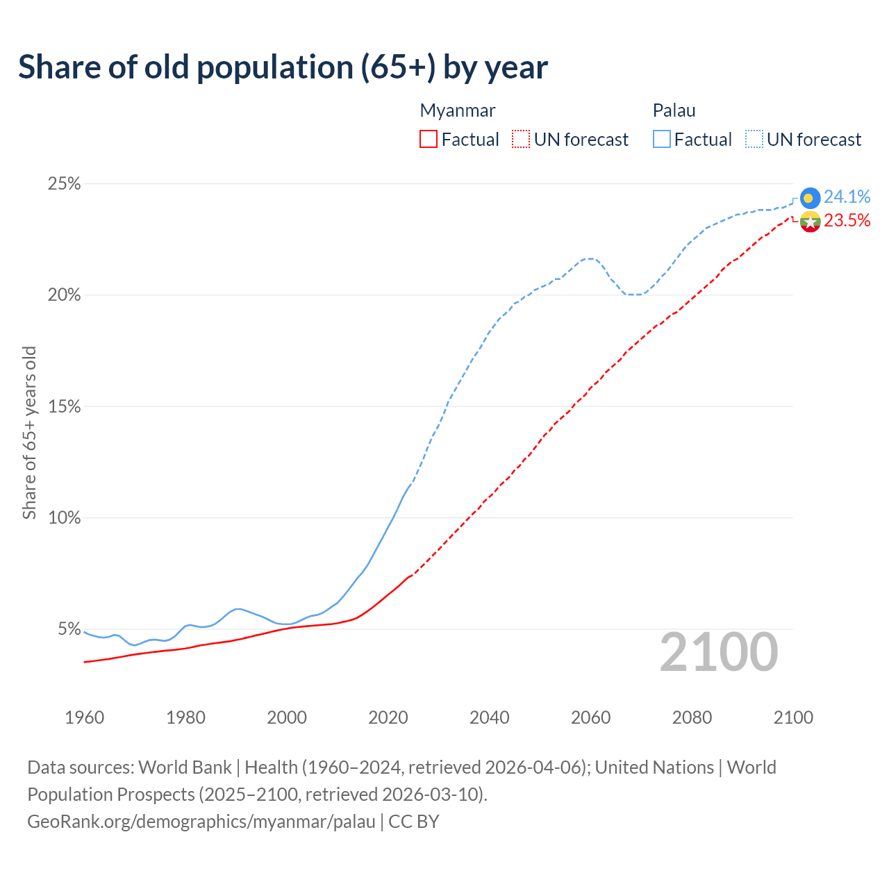 The share of older people aged 65 and over is 7.3% in Myanmar and 11.3% in Palau. Life expectancy in Myanmar compared to Palau .