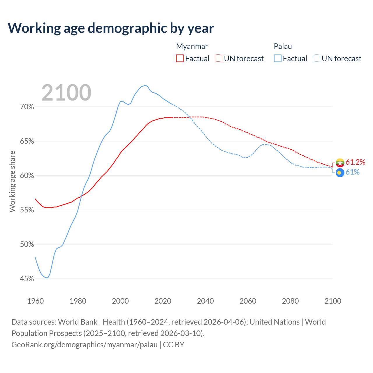 - Myanmar has 37.8M working age adults (aged 15-64) vs 12.4K in Palau.
