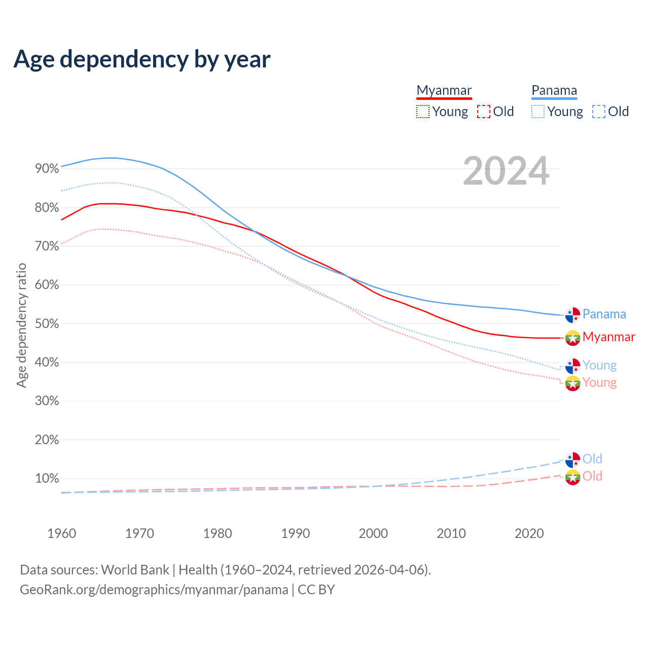 - Myanmar is ranked 96/196 by median age (oldest to youngest) vs 94/196 for Panama.