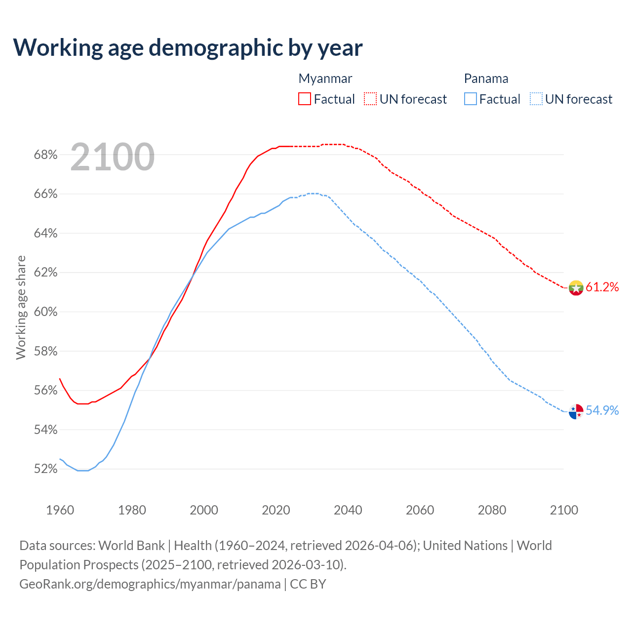 - Myanmar has 37.8M working age adults (aged 15-64) vs 3.05M in Panama.