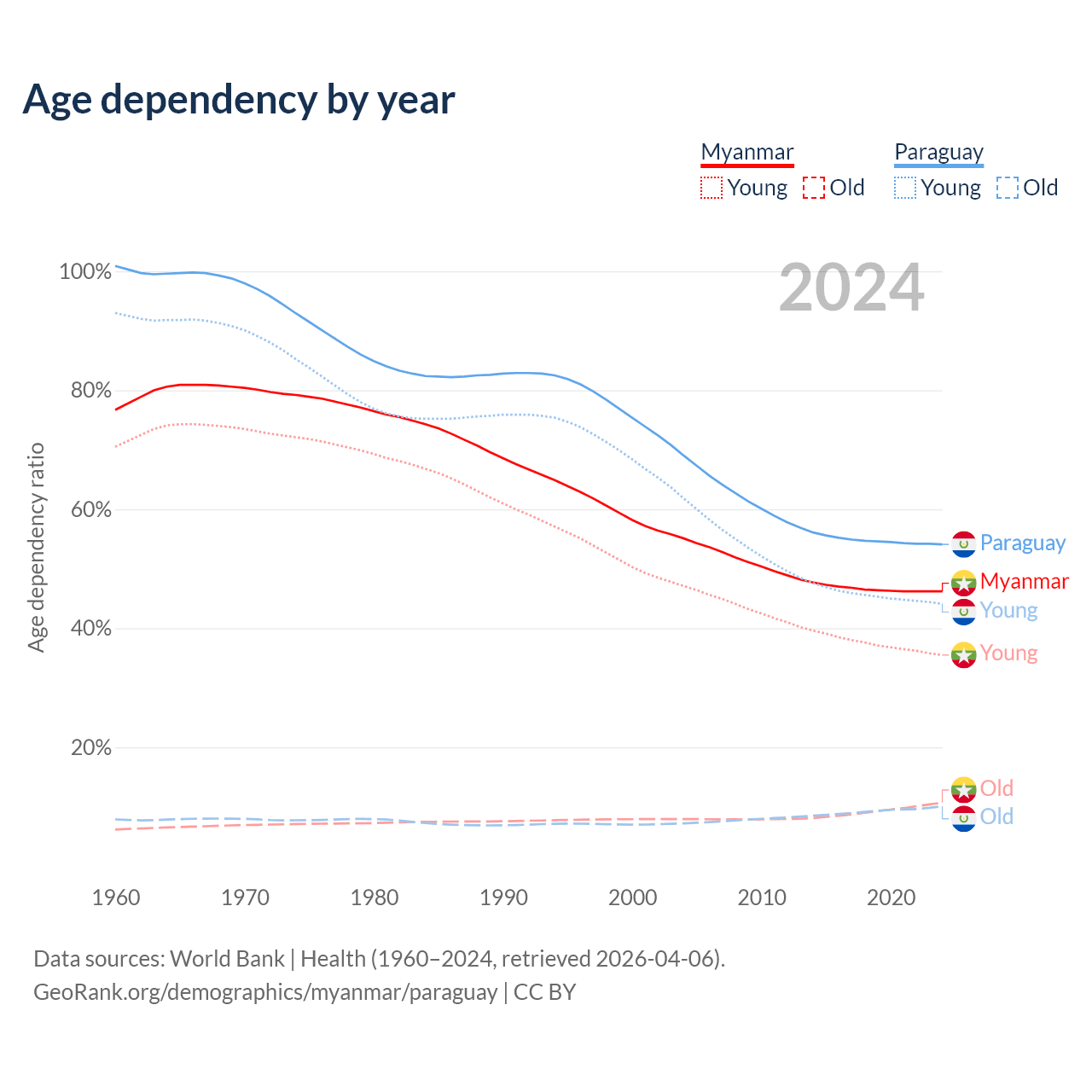 The share of older people aged 65 and over is 7.3% in Myanmar and 6.54% in Paraguay. Life expectancy in Myanmar compared to Paraguay .