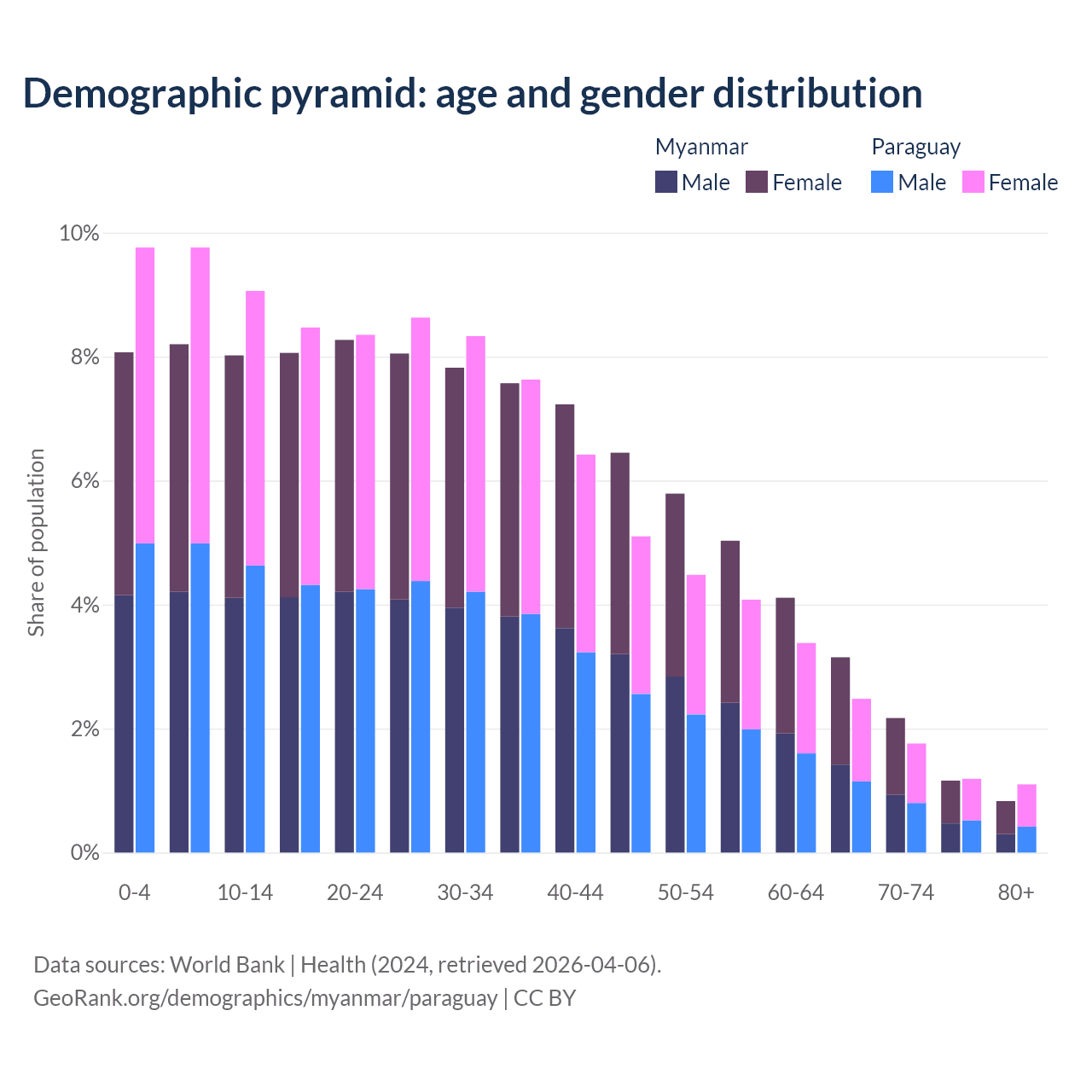 - Myanmar is ranked 96/196 by median age (oldest to youngest) vs 118/196 for Paraguay.