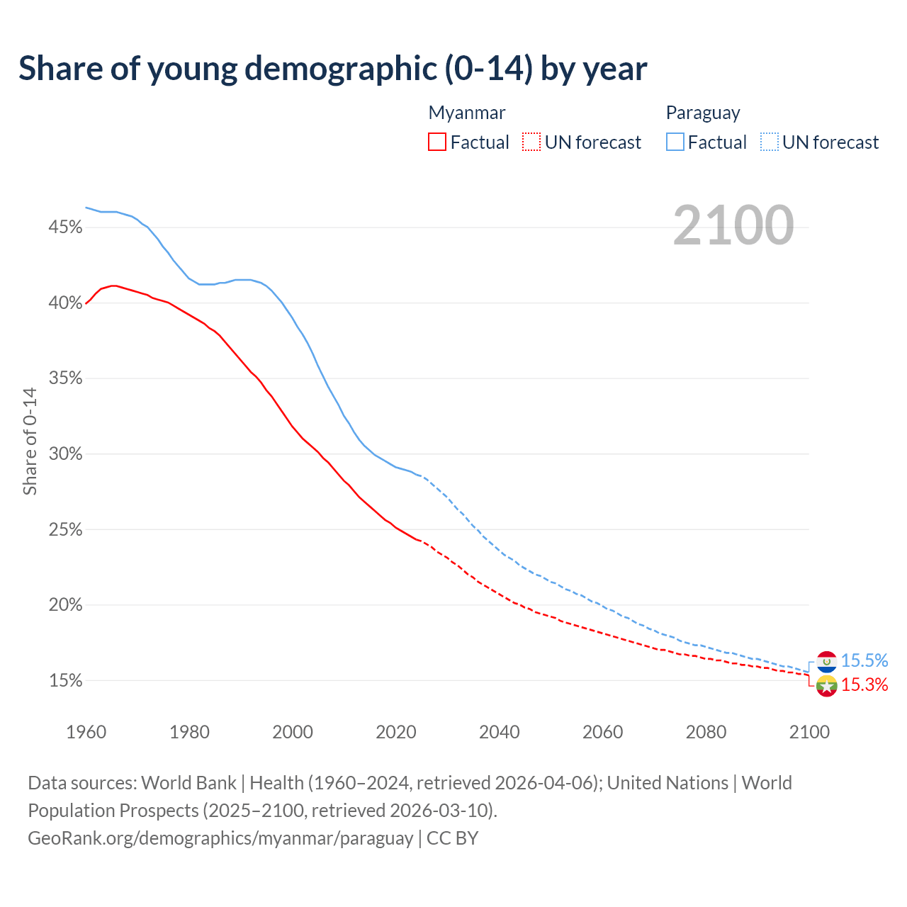 - The share of young demographic (0-15 years old) in Myanmar is 24.3% vs 28.6% in Paraguay.