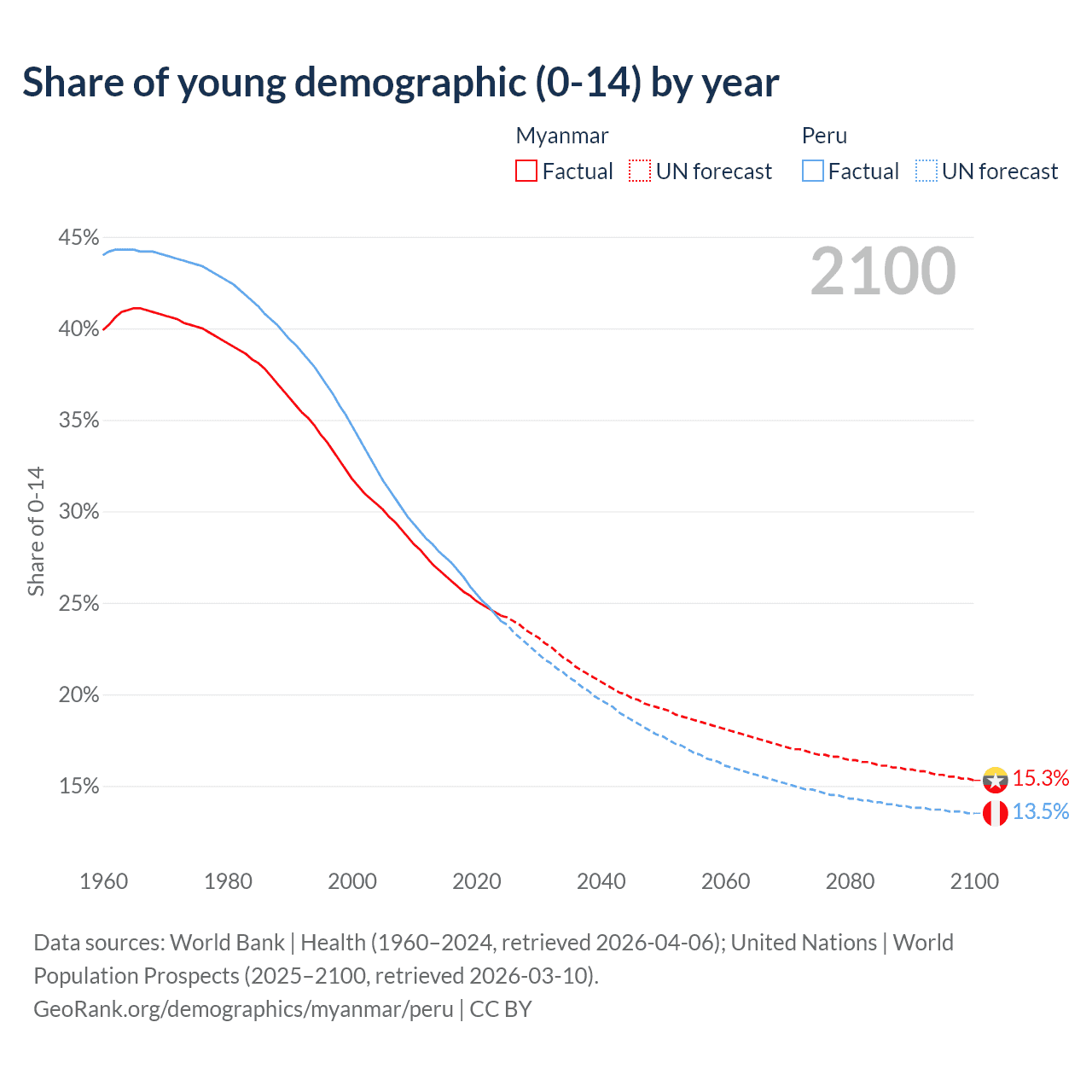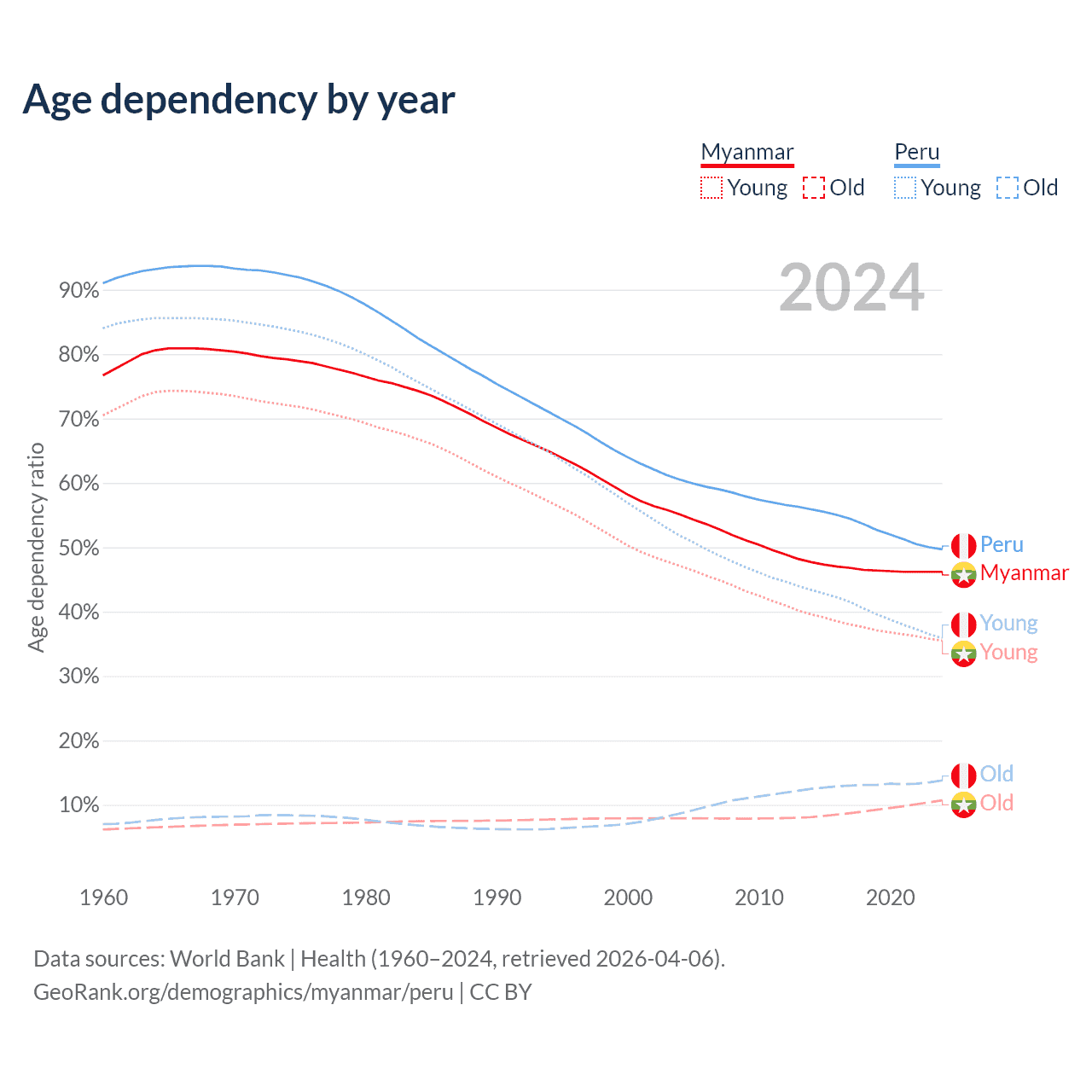 - Myanmar is ranked 96/196 by median age (oldest to youngest) vs 97/196 for Peru.