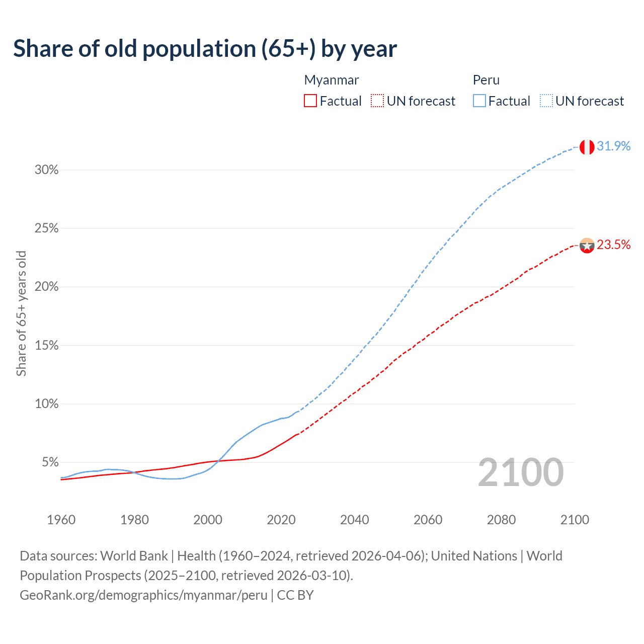 The share of older people aged 65 and over is 7.3% in Myanmar and 9.23% in Peru. Life expectancy in Myanmar compared to Peru .
