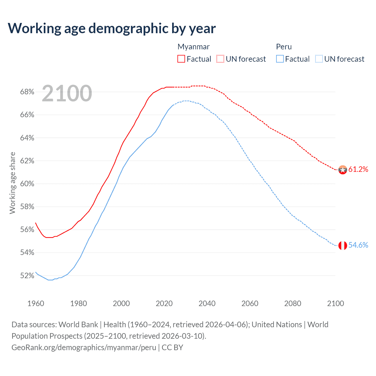 - Myanmar has 37.8M working age adults (aged 15-64) vs 23.4M in Peru.