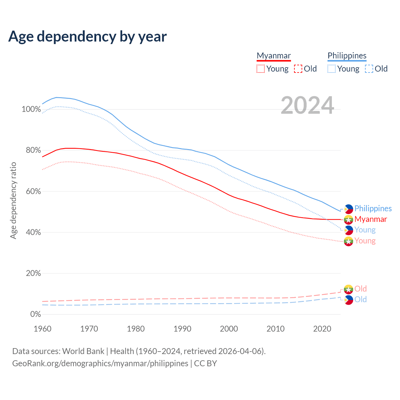 Data sources: World Bank | Health (1960–2024, retrieved 2026-04-06); U.S. Census Bureau (1960–2024, retrieved 2026-02-08).