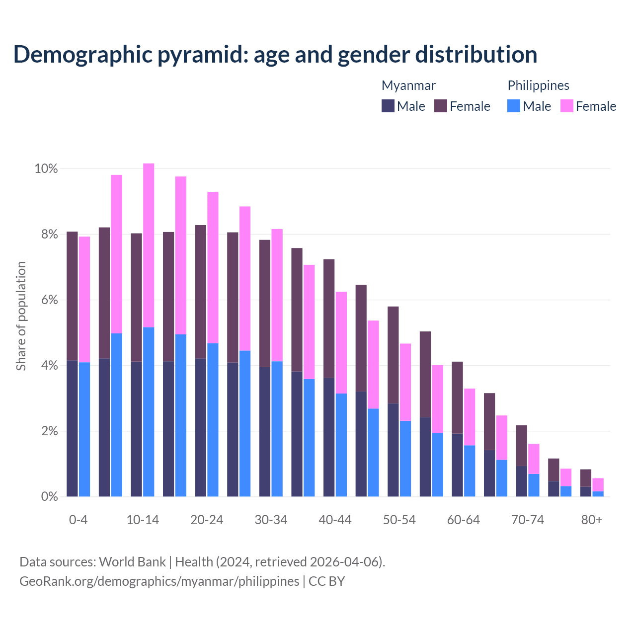 - Myanmar is ranked 96/196 by median age (oldest to youngest) vs 123/196 for the Philippines.