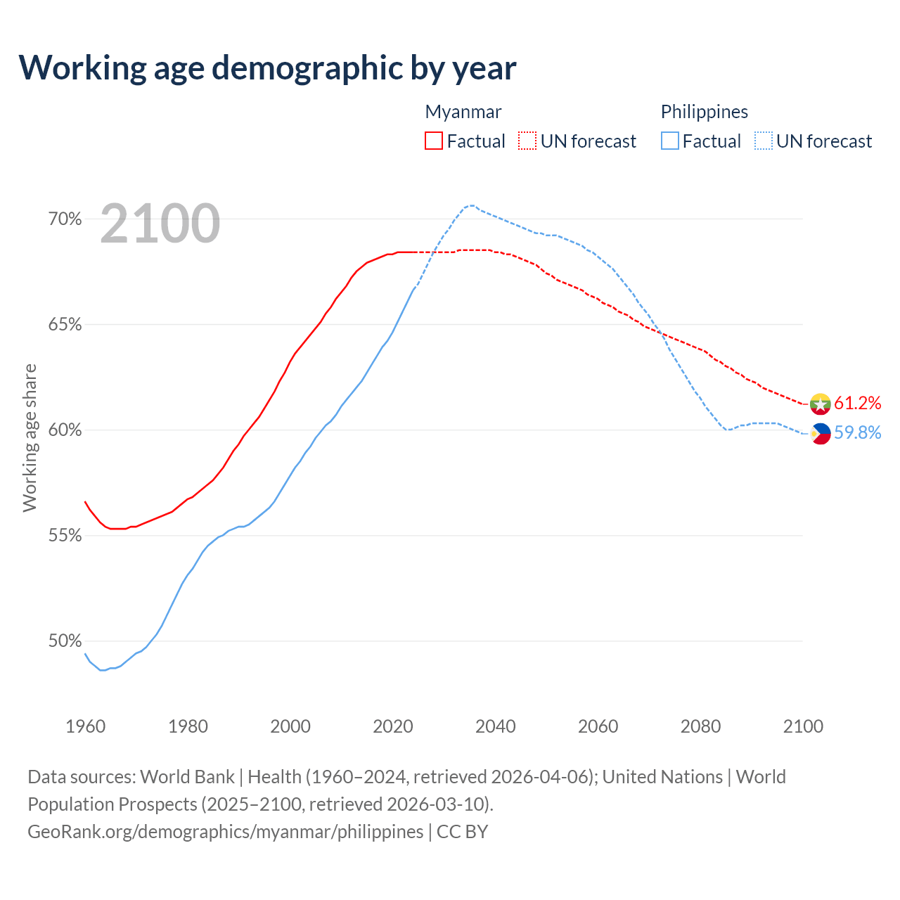 Median age Myanmar vs Philippines, 1960-2100