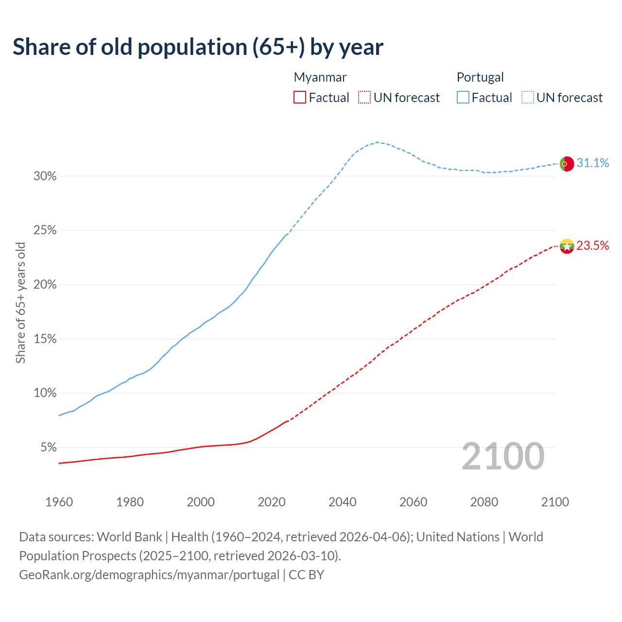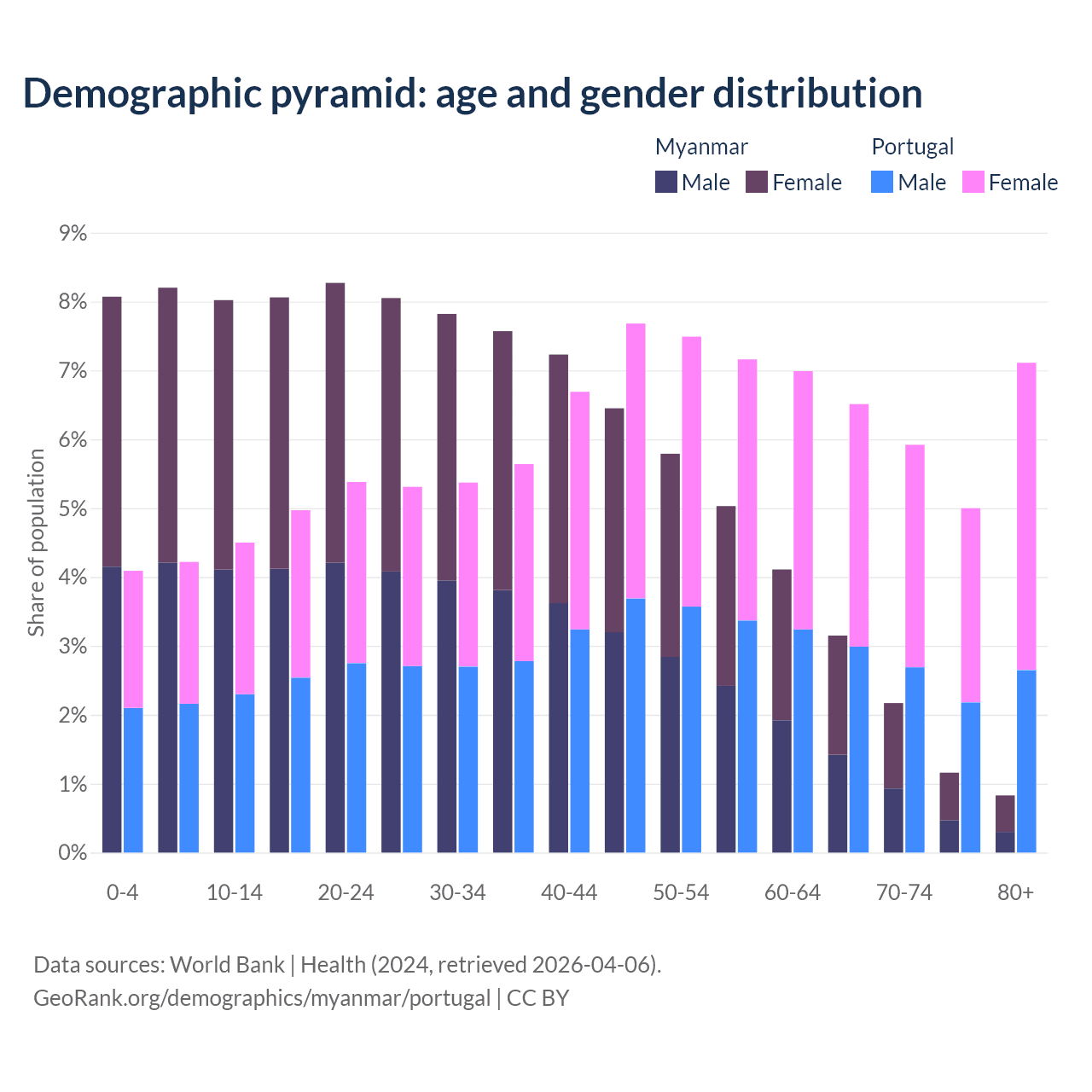 The share of older people aged 65 and over is 7.3% in Myanmar and 24.5% in Portugal. Life expectancy in Myanmar compared to Portugal .