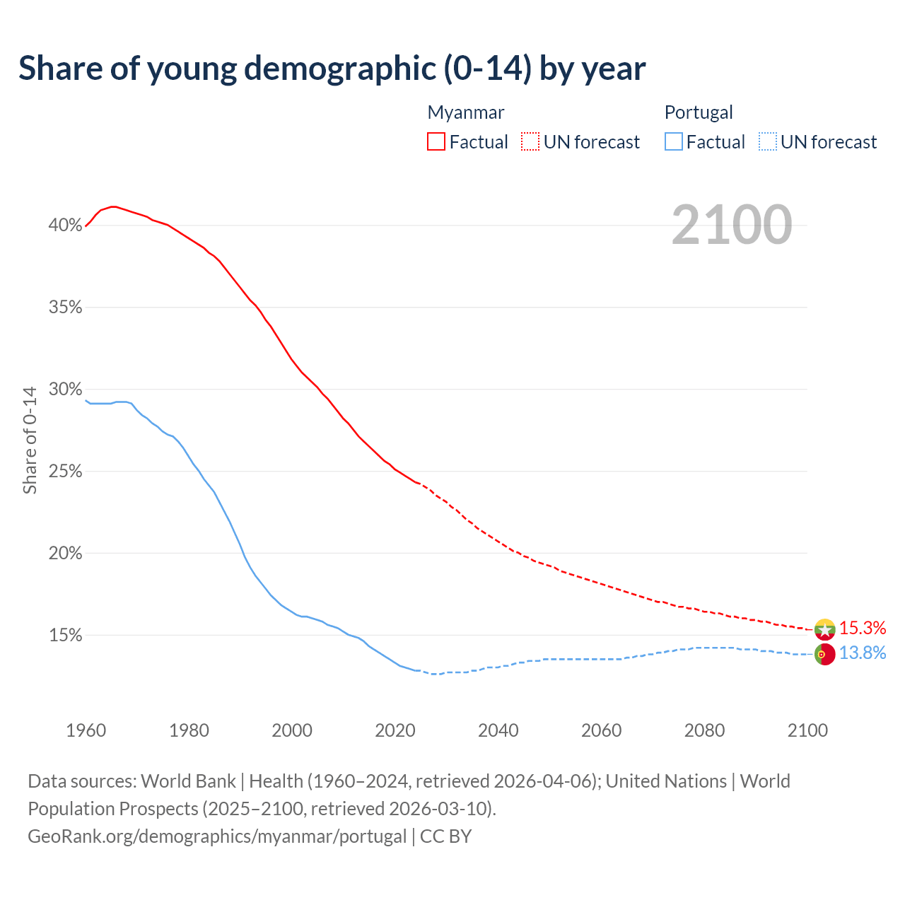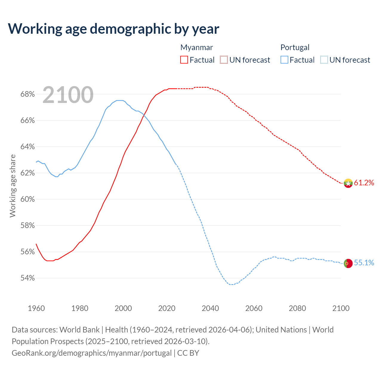 Median age Myanmar vs Portugal, 1960-2100