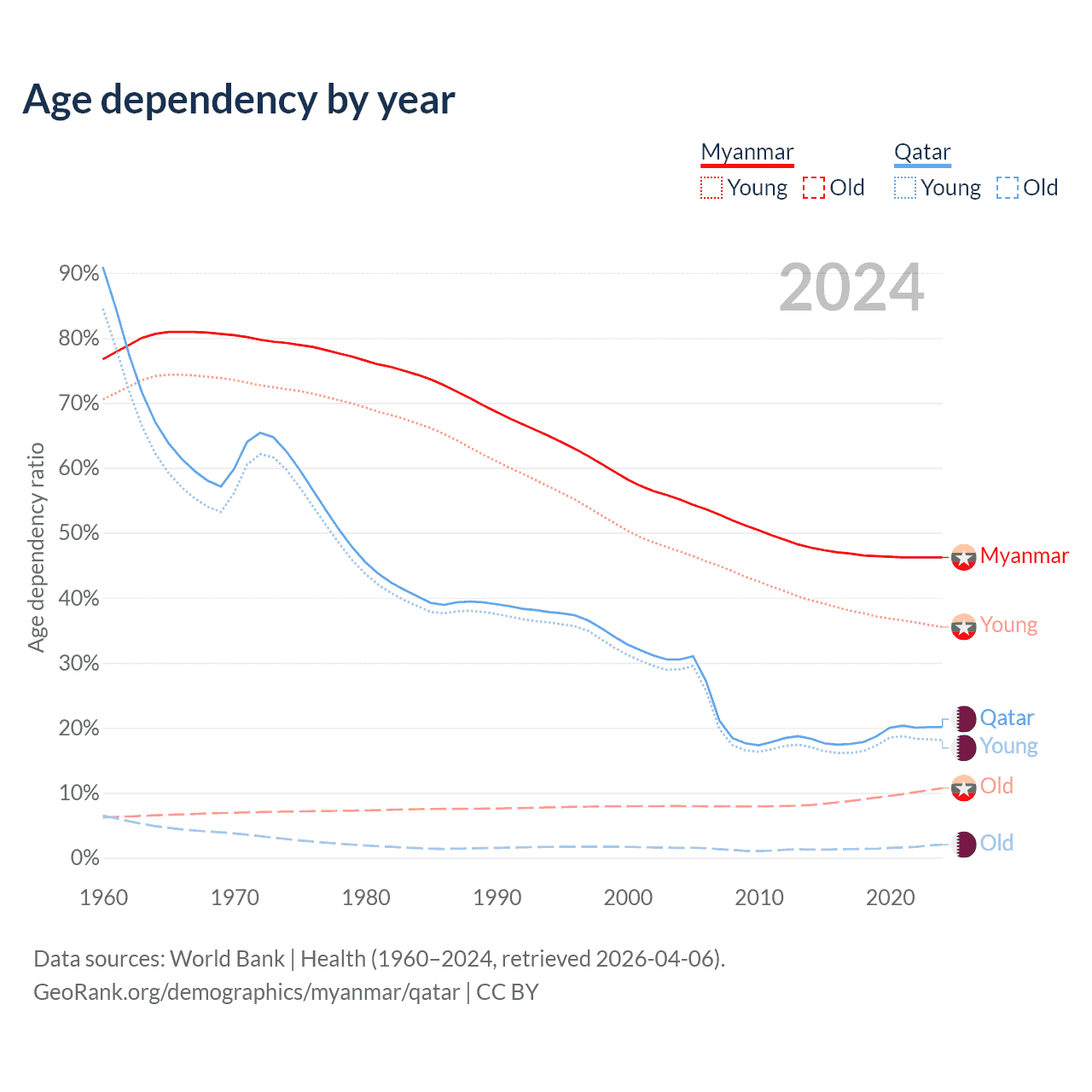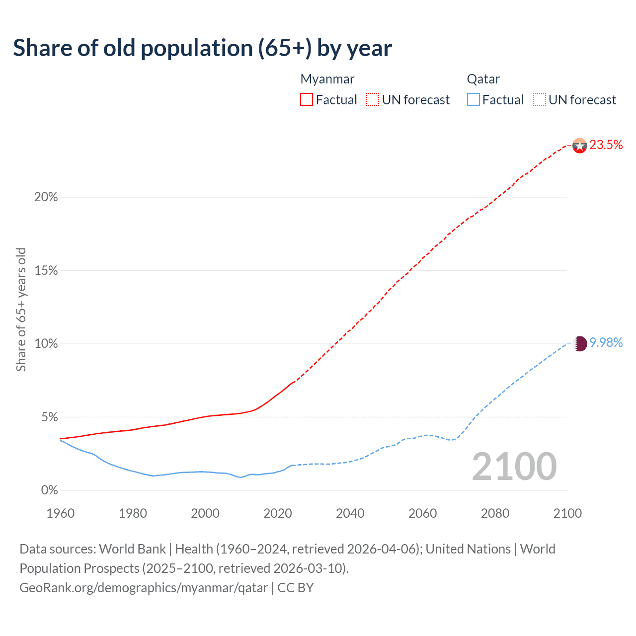 The share of older people aged 65 and over is 7.3% in Myanmar and 1.68% in Qatar. Life expectancy in Myanmar compared to Qatar .