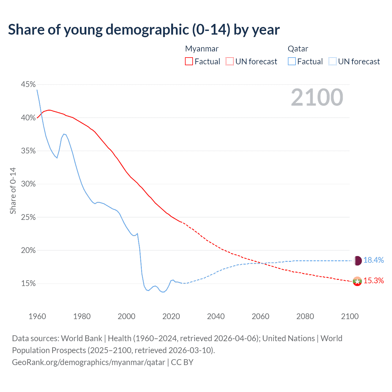 - The share of young demographic (0-15 years old) in Myanmar is 24.3% vs 15.1% in Qatar.