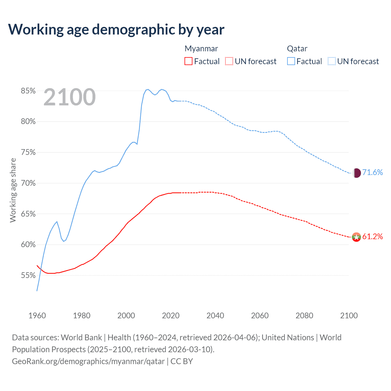 Median age Myanmar vs Qatar, 1960-2100