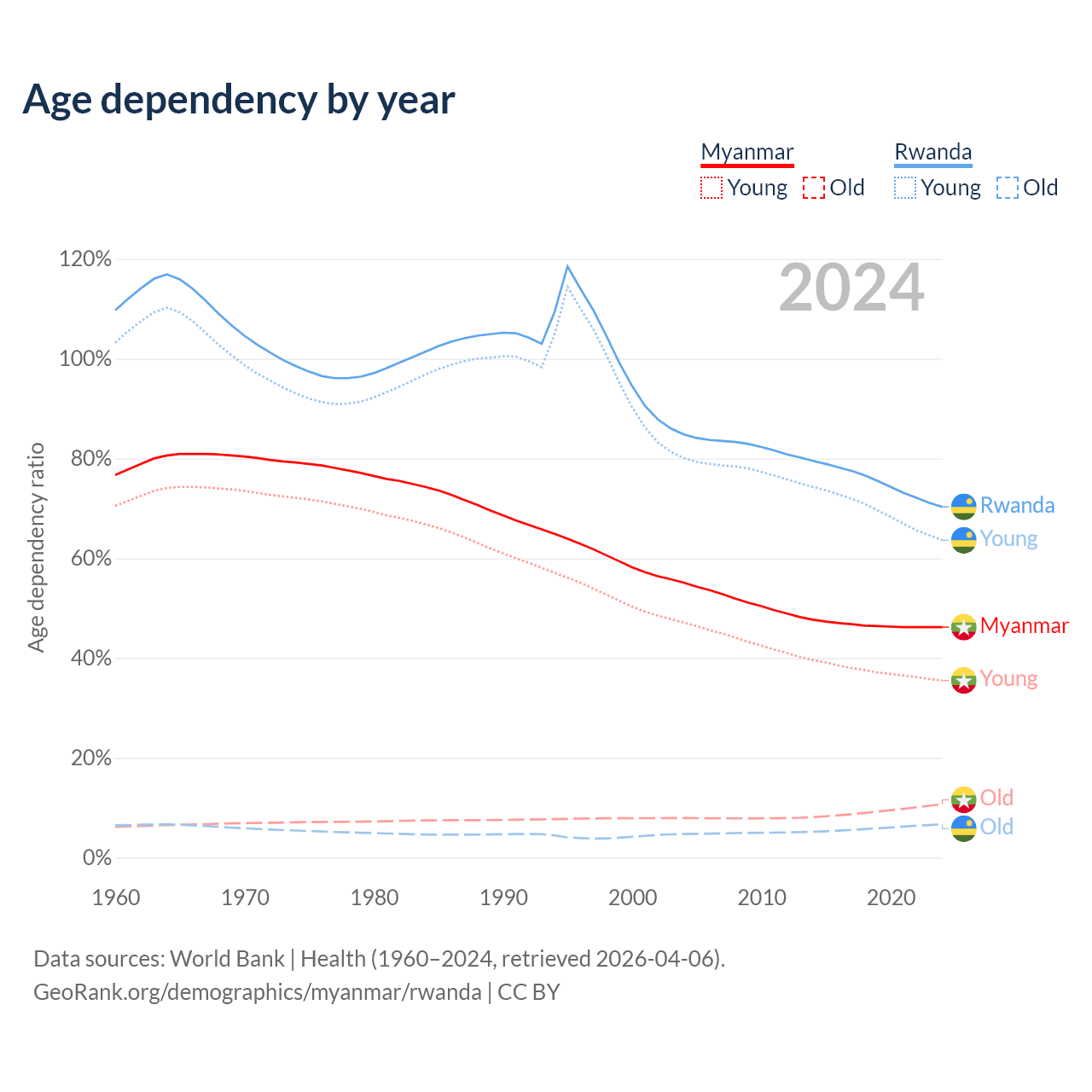 - Myanmar is ranked 96/196 by median age (oldest to youngest) vs 160/196 for Rwanda.